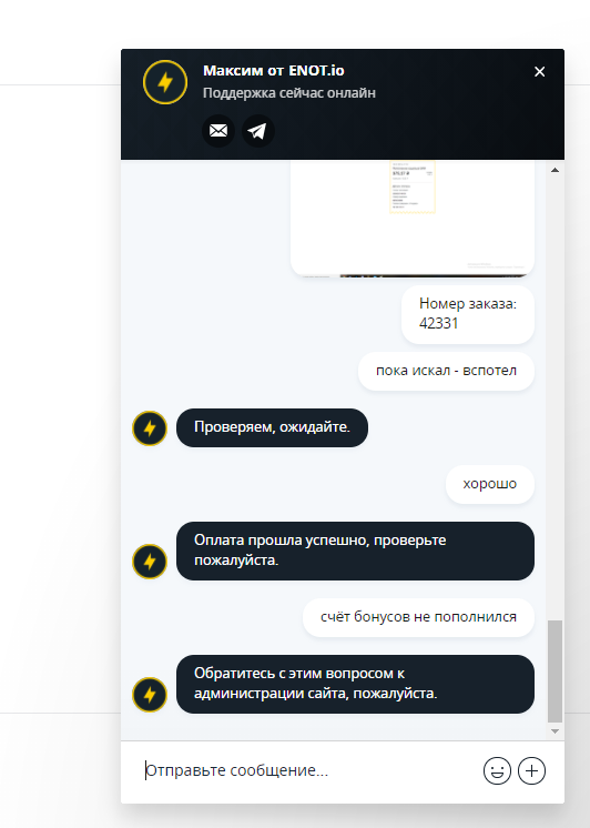 Здравствуйте. Пополнял счёт через enot.io с помощью eth. прошло более 24x часов, бонусы не пришли.