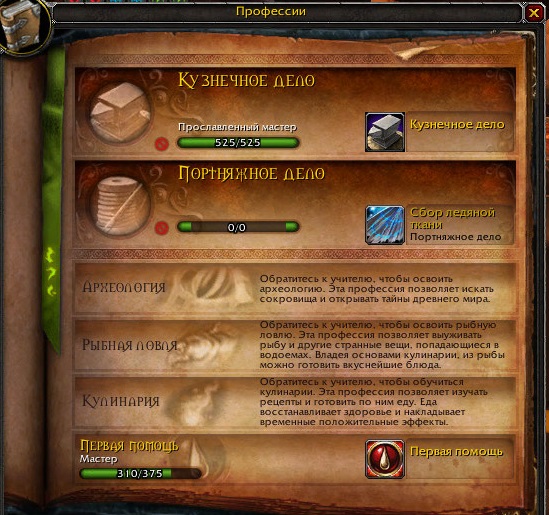 Доброго (или не очень, раз уж мы все здесь собрались) времени суток. При отмене профессии "Портняжное дело" забагалось умение "Сбор ледяной ткани". Теперь шитья нет, а сбор работает. Новую профессию выучить не могу. Антиэррор не помогает. Выглядит это так: Вложение 1045244