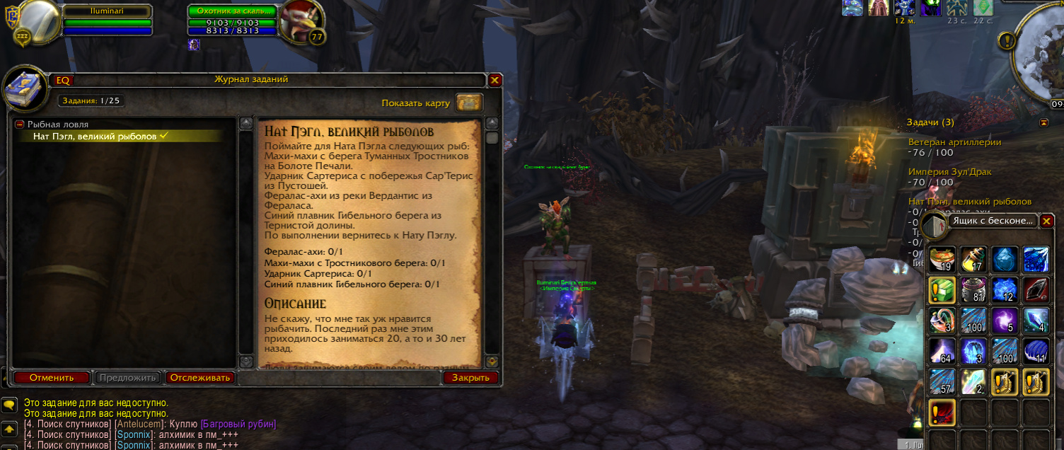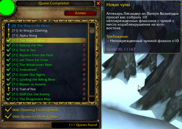 Доброго времени суток, делая ачивку Империя Зул*Драк выполнено 70 квестов, более квестов нигде нет, пройдены все цепочки квестов в других локациях, ачивки все получены, аддон ЕвериКвест показывает нет не выполненных квестов в зулДраке, в чем проблема? выбил итем Змеевидное колье, однако, квест не берётся, пишет Квест для вас не доступен, бегал с макросами для поиска незаконченных квестов, есть не законченные кв, но их нет на локации, взять их физически неукого, помогите пожалуйста с данной проблемой, сервер х100, ник персонажа Iluminari