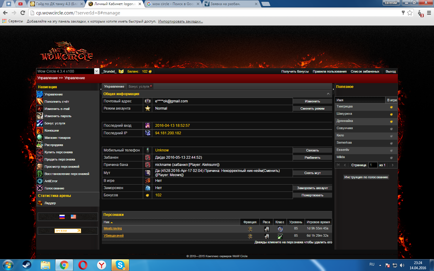 5. Я был забанен на сервере WoW Circle 4.3.4 x100 по причине не корректного ника (Убивцахачей). За несколько часов до бана я получил мут по той же причине на 4 дня, после чего я зашёл на сайт и пожертвовал 100р для того чтобы сменить ник, мне не разрешили сменить ник по причине YouAreMuted. Я прошу снять бан и мут для того чтобы я смог поменять ник и продолжить играть на сервере. Ник моего аккаунта _Srundel_Вложение 330243