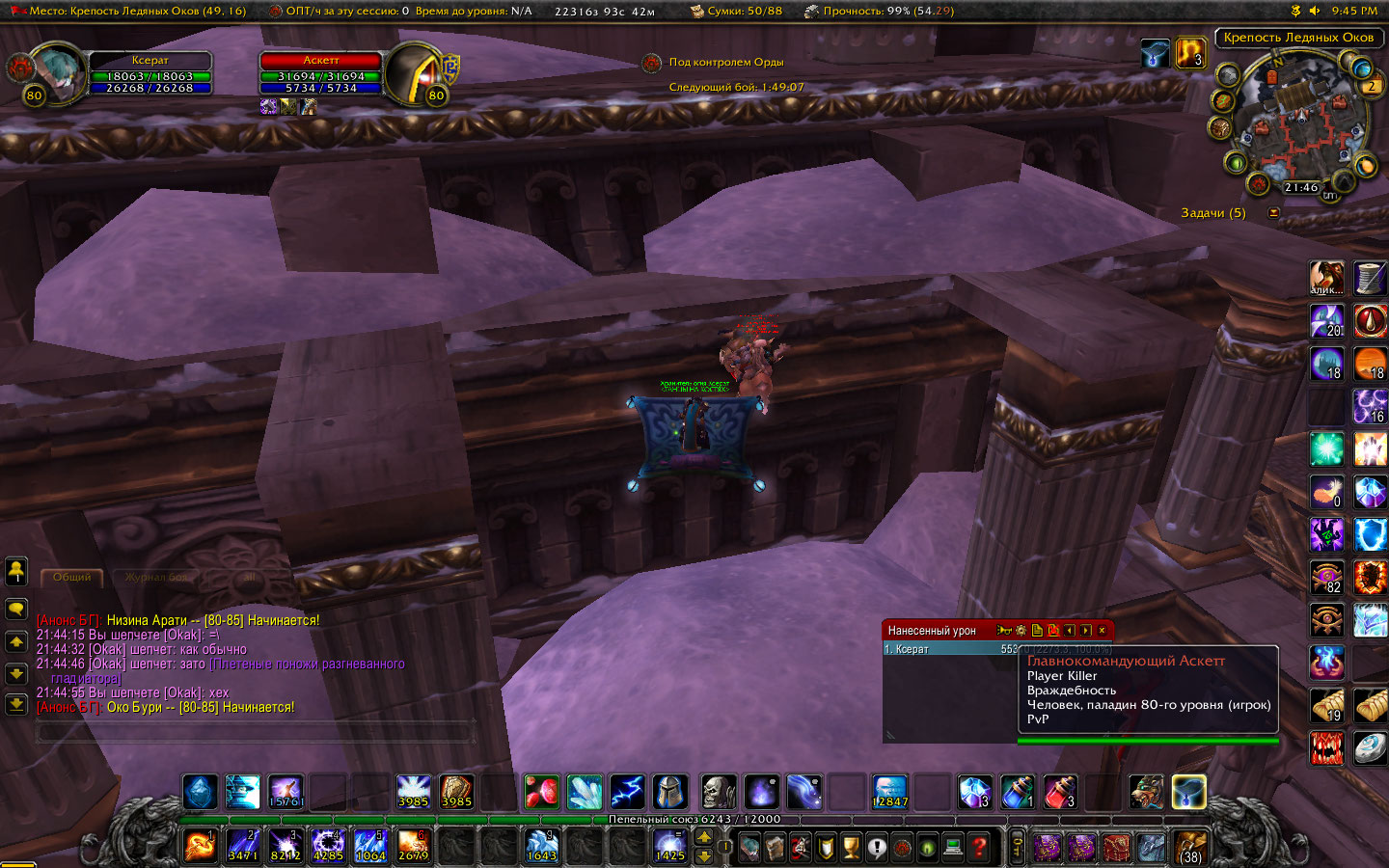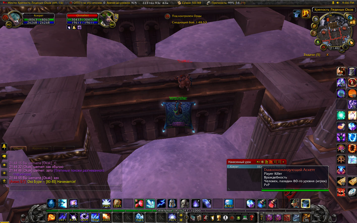 Пару месяцев назад я уже открывал спор по поводу неприемлемого поведения игроков Альянса, флайхакающего осадными машинами финальную комнату Озера Ледяных Оков. Спор был моментально закрыт, а нарушители не выявлены и не наказаны. И вот, снова, представители этой фракции отнимают у Орды поводы для уважения своего игрового оппонента. На этот раз - багоюз. Скрины с именами нарушителей (какие успел наскринить, хотя их было много больше, учитывая что благодаря им туда, нарушая правила игры, проник рейд из 25 игроков) прилагаются ниже. Как видно из приведённых скринов, нарушители пробрались внутрь с помощью трёхместных мамонтов через прореху в текстуре самой крепости.