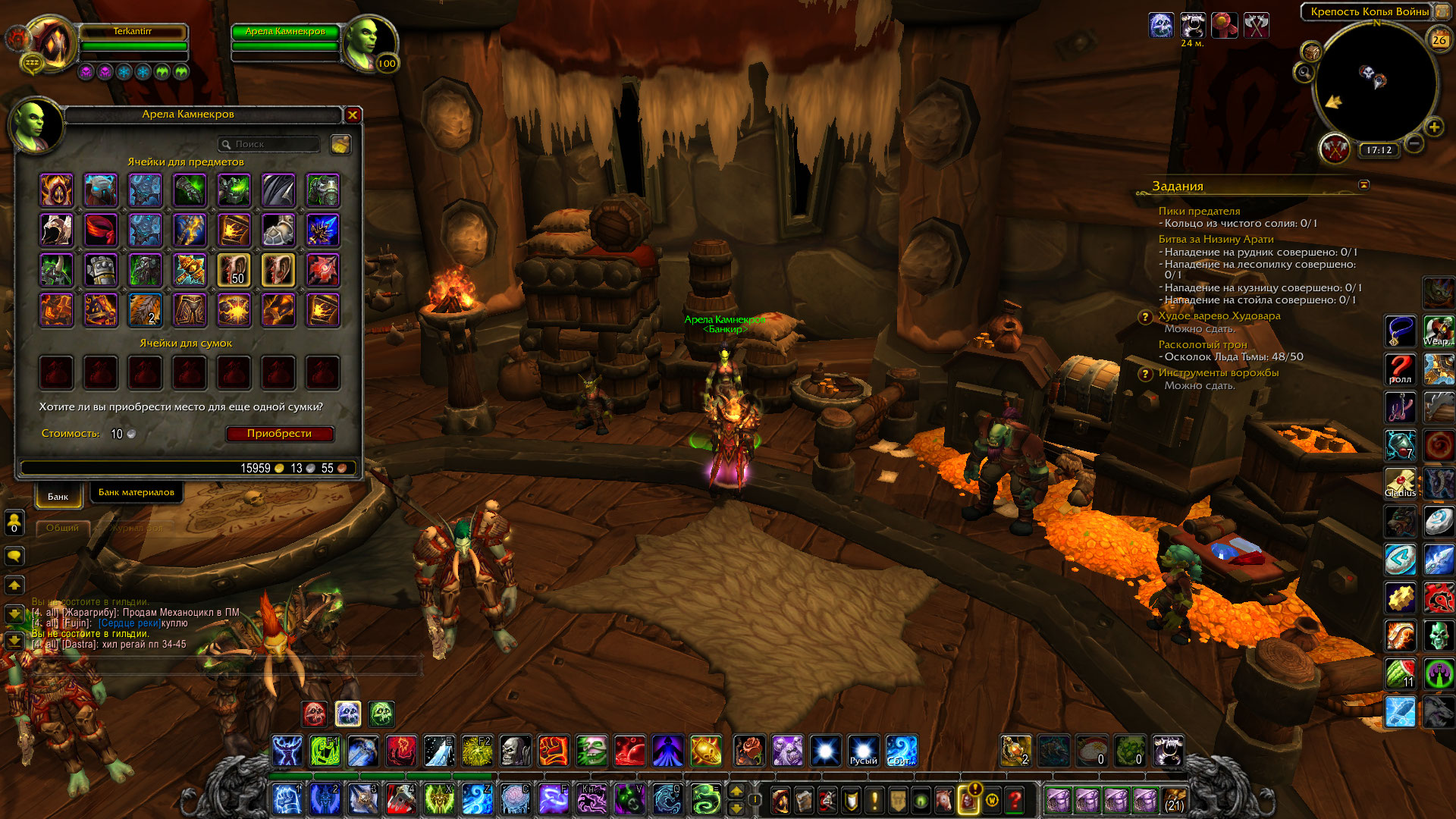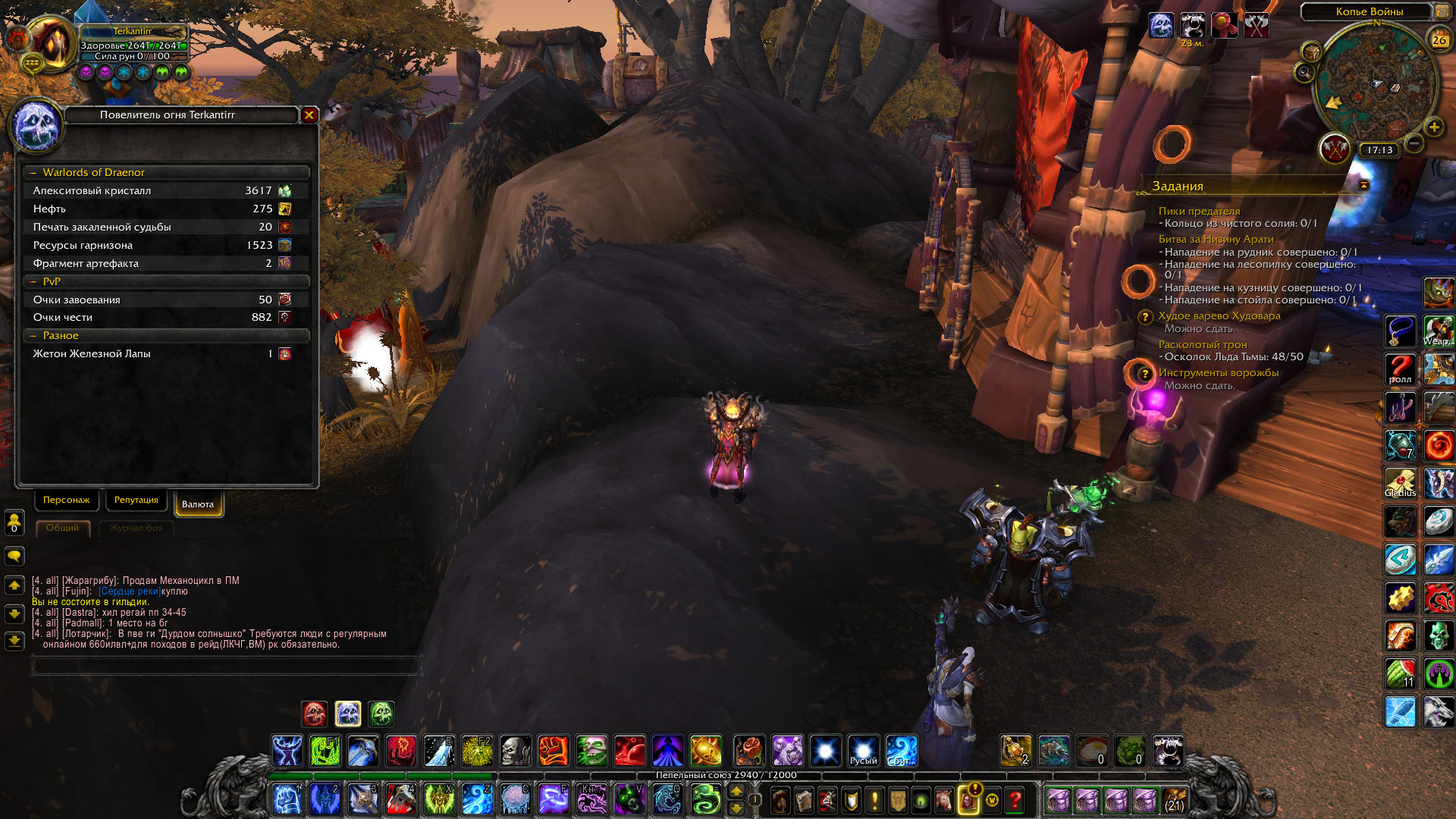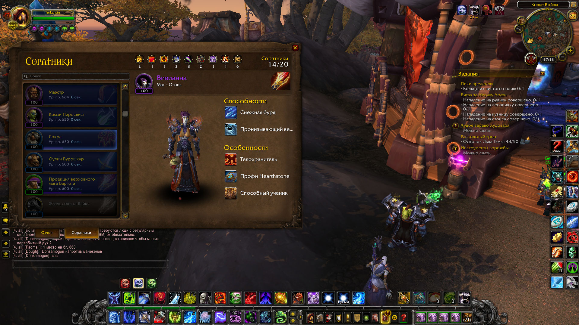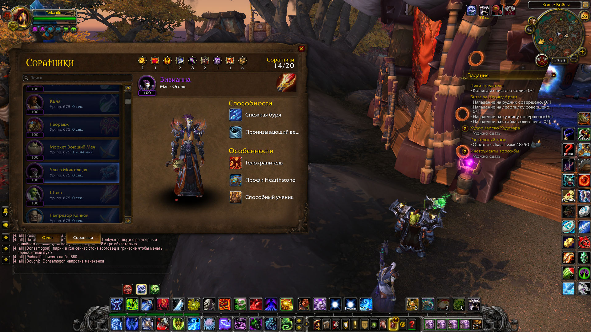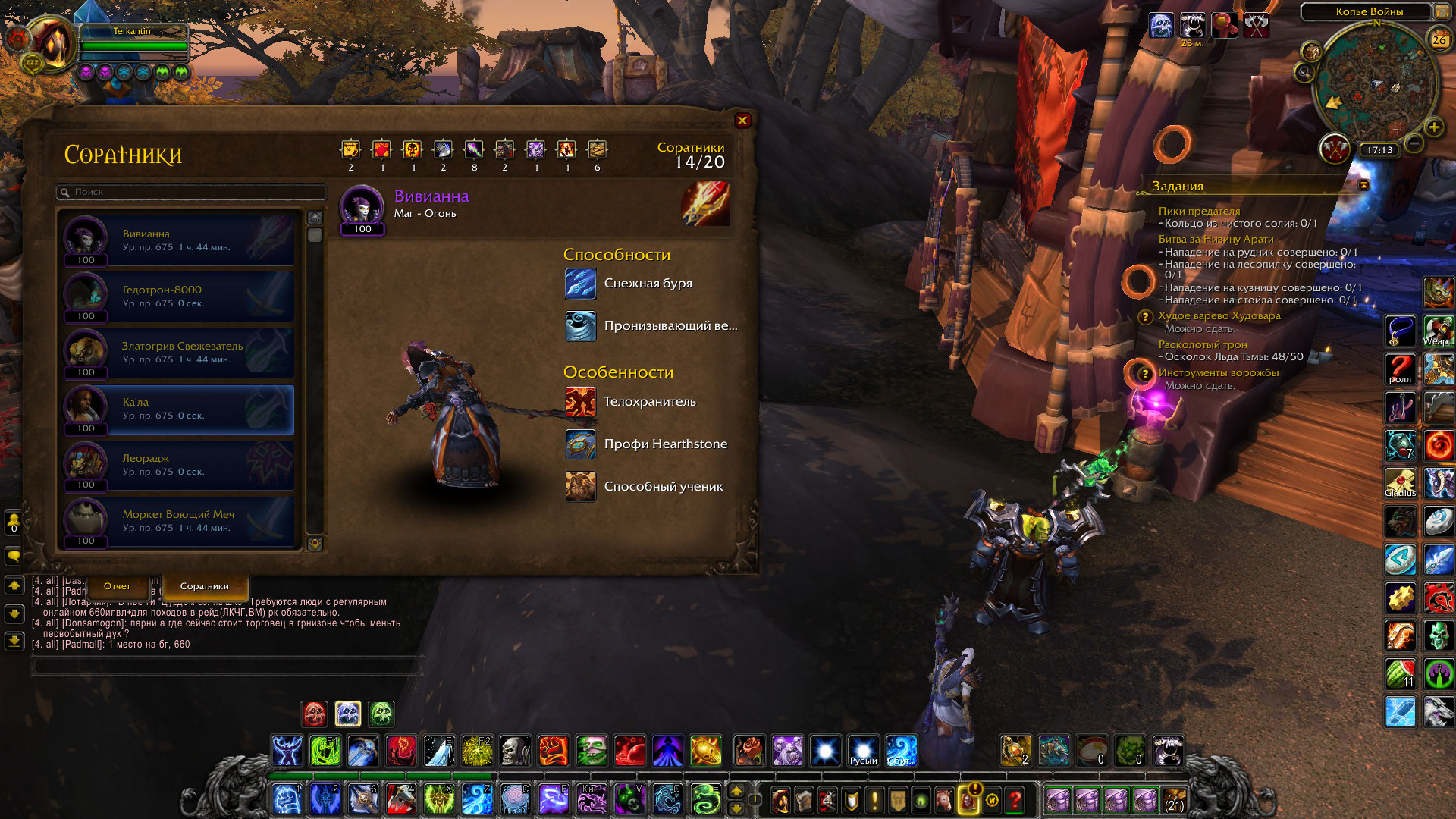 3)На персонаже, помимо прокаченной со всеми ресами инженерки и горного дела есть гарнизон 3лвл с 3лвл лесопилкой и утилем. Соратники гарнизона практически все 675 кроме последних четырех. Кроме того на персе есть куча трансмога в банке с ЦЛК, ОП 25(гер) и в последней сумке прикольное копье на трансмог двуручки и топор ледяной-идеал для фроста. Но это не главное. А что главное? А главное - в последней сумке Пепел Ал'ара (200бонусов лк), Ледяная скорбь (150бонусов лк), Стремительный ветробег (250 бонусов лк), Безднус(спутник, 26 бонусов лк) и Сестра искушения (спутник, 26 бонусов лк), Медальен Джайны (36 бонусов лк). Итого 688 бонусов в последней сумке на персонаже я оставляю. У меня уже эти питомцы есть на мейне. Барана Хмельного фестиваля я не считаю, также как и игрушку Сжиматель мира.