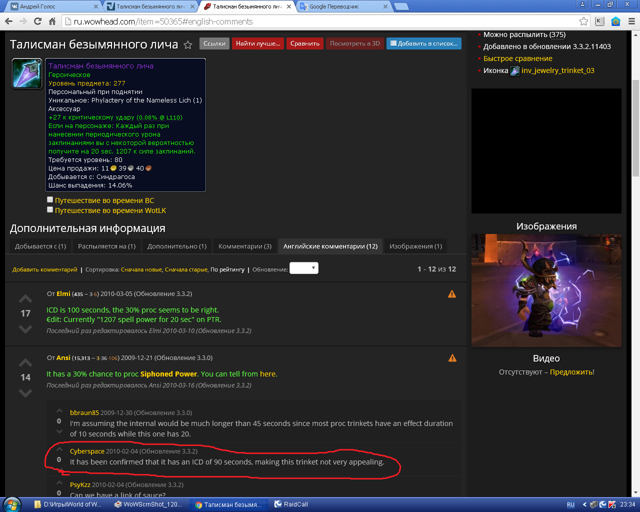3) должен прокать через 75 секунд http://wowroad.info/?item=50365#comments(само собой у талика есть шанс прока и это время увеличивается на секунды 2-3, но не на 20. Это примерно каждый второй прок объекта, который работает правильно и у которого скрытый кд 45 сек). Ошибка скорее всего заключается в том, что не в ту сторону накрутили кд. по сравнению с объектом и чешкой, у которых после прока запускается кд в 45секунд = 15 секунд с проком и 30 секунд простоя(без прока). Что касается талисмана: 95 секунд после прока = 75 секунд простоя(без прока) +20 секунд с проком. Вывод: должно быть 75 секунд = 20 секунд с проком и 55 секунд простоя (без прока)