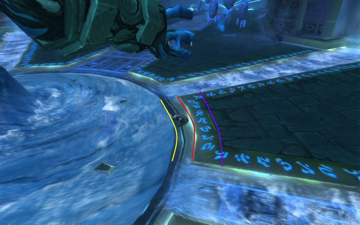 грубо говоря, танку нужно стоять перед желтой полосочкой, если он сделает шаг вперед, его откинет босс, и в момент падения танка на платформу, он превратиться в трупик с вероятностью 80%+ процентов, если он сделает шаг назад - то босс начнет плеватся кастом искажающий взрыв, первый пережить не проблема, а вот от 2-го может спасти только плащ/фулл сейф. А должно быть так, что танк может отойти к синей полосочке и спокойно передвигать свой толстый зад со стороны в сторону не боясь получить ваншот в лицо