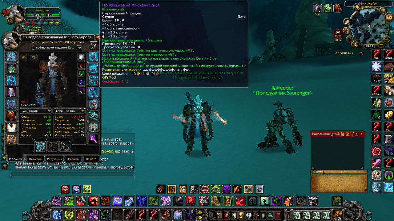 5.Хороший дикей,одевал сам.В пве адк не хватает 3 шмотки до биса и эти шмотки выбить не проблема (запы,плащ,кисти),пока висит тема,может успею их и доодеть.Также хороший танк ,которым можно протанковать любой инст,любой сложности.В пвп до бис шлем и грудак а8 нужны(стоят а7),ну может "профессионалы" скажут что нужен выбор.Фдк 6.4+(предбис) .Грубо говоря дикей предбис каждый спек,такой дк отлично подойдет тем людям ,кто не ищет фул бис,а скажем так - персонажа в отличном состоянии,но над которым еще можно чуть-чуть поработать!(для покупателя будет сюрприз в виде забитых сумок БоЕшками+в сумках лежат еще 2хм токена).Если надо будет показать персонажа в игре,то пишите в тему или в лс,обязательно покажу!Есть шмот на посланника (не весь)
