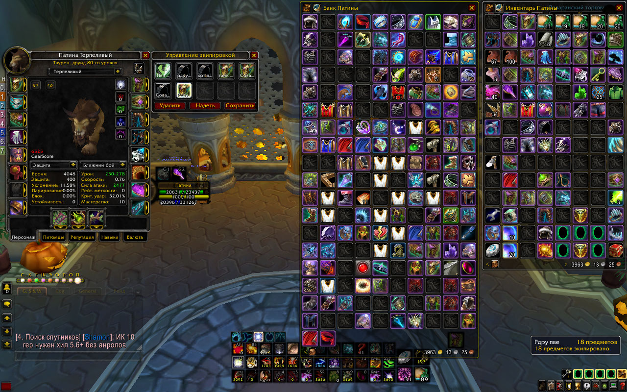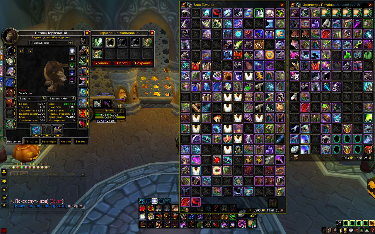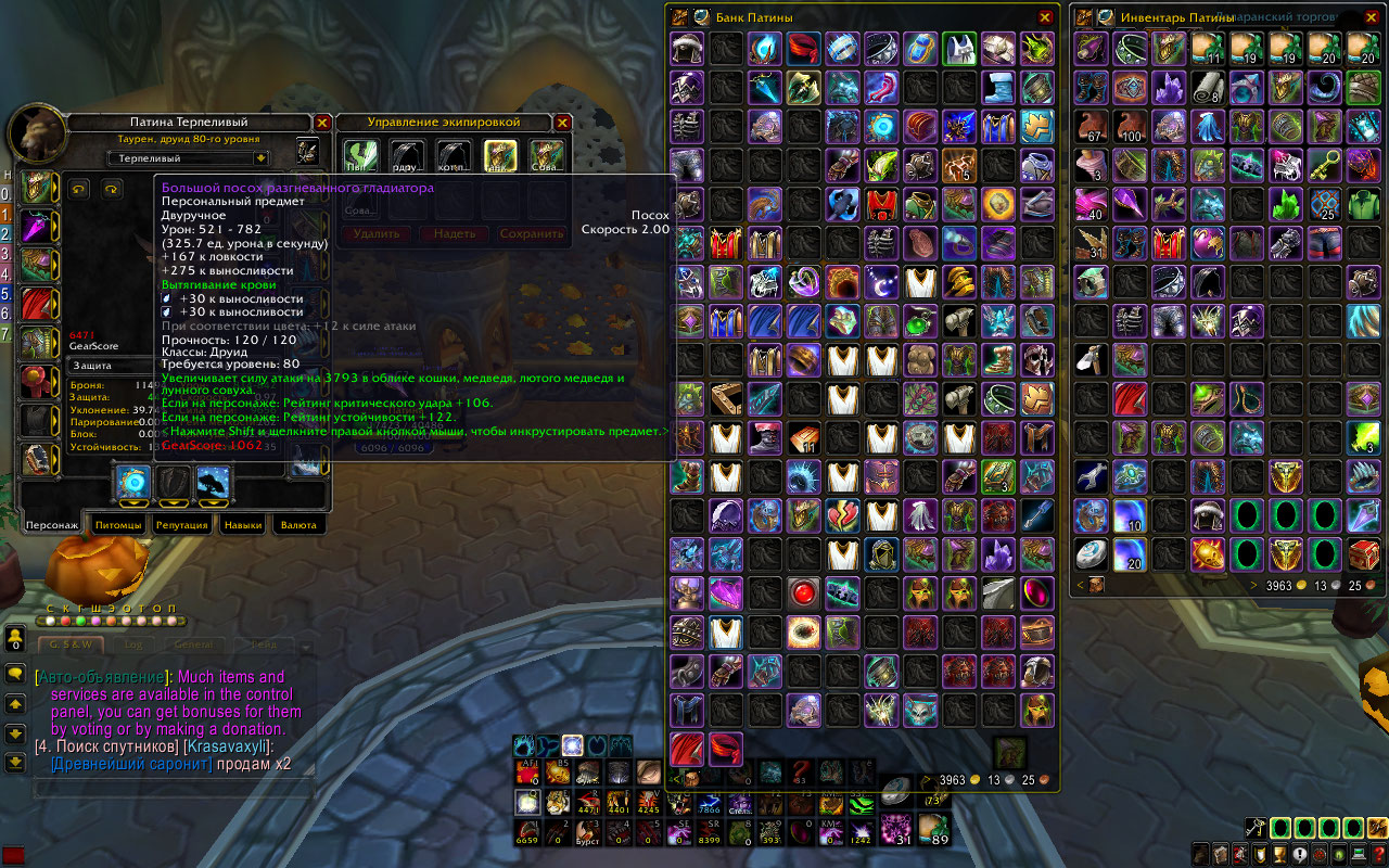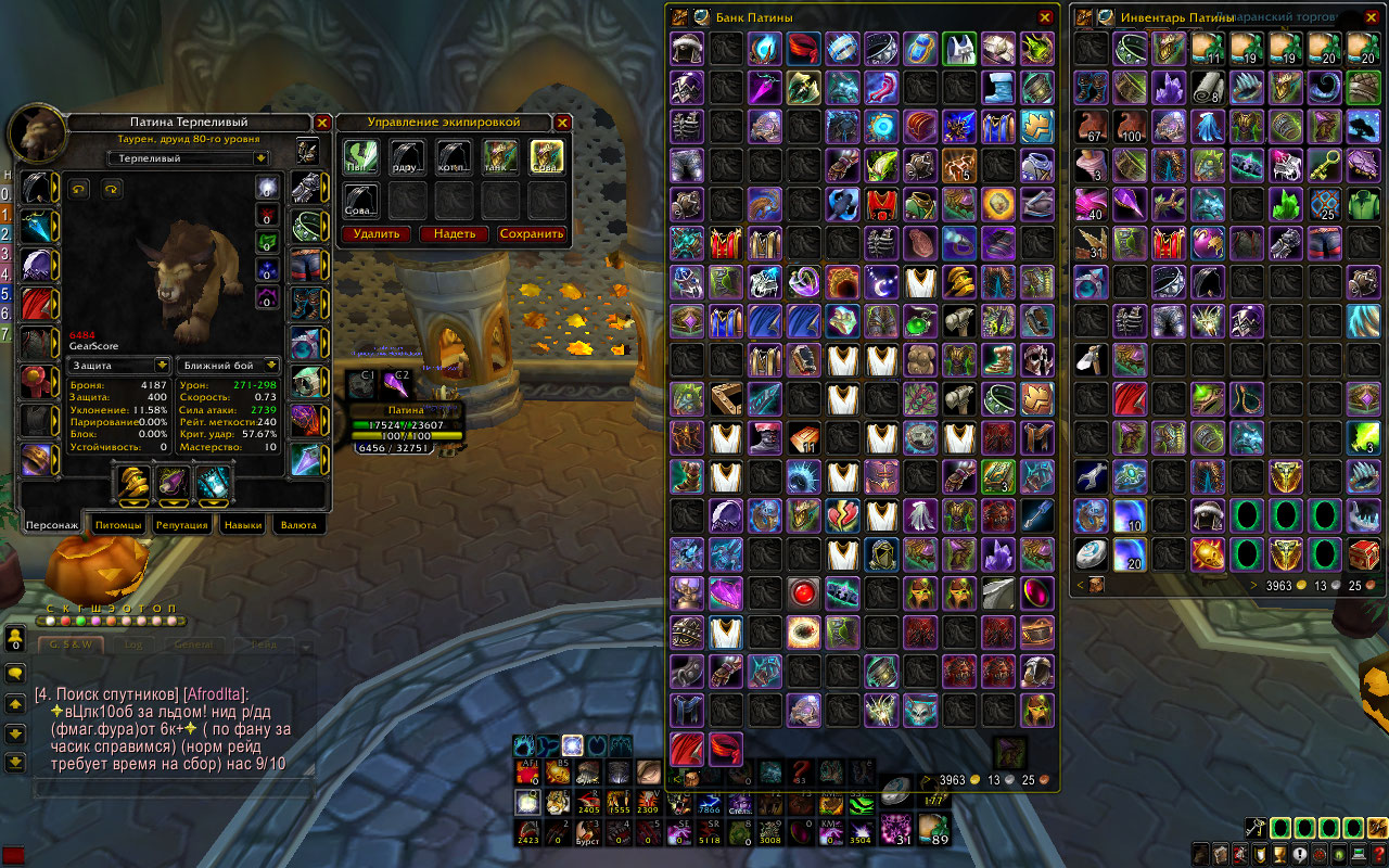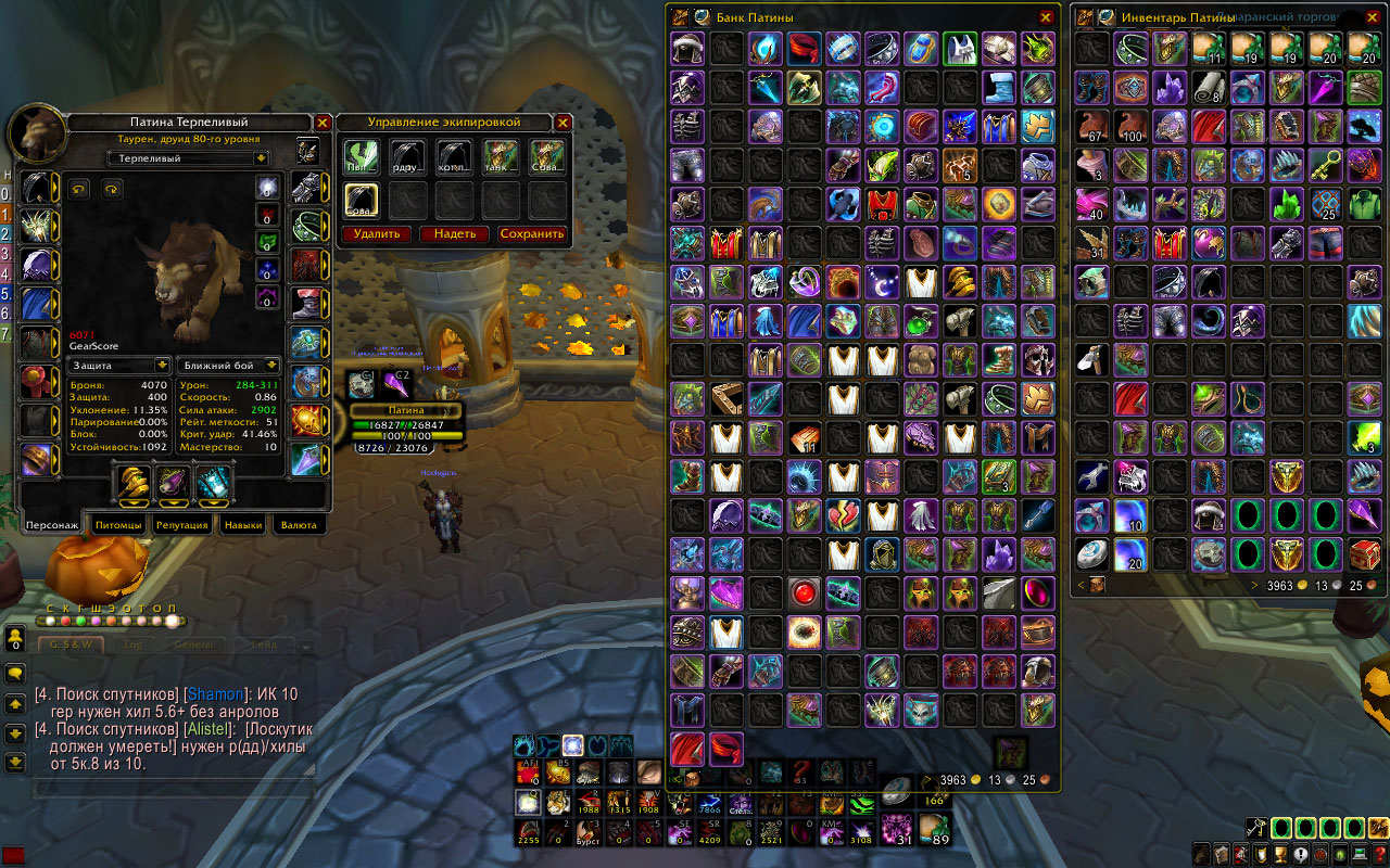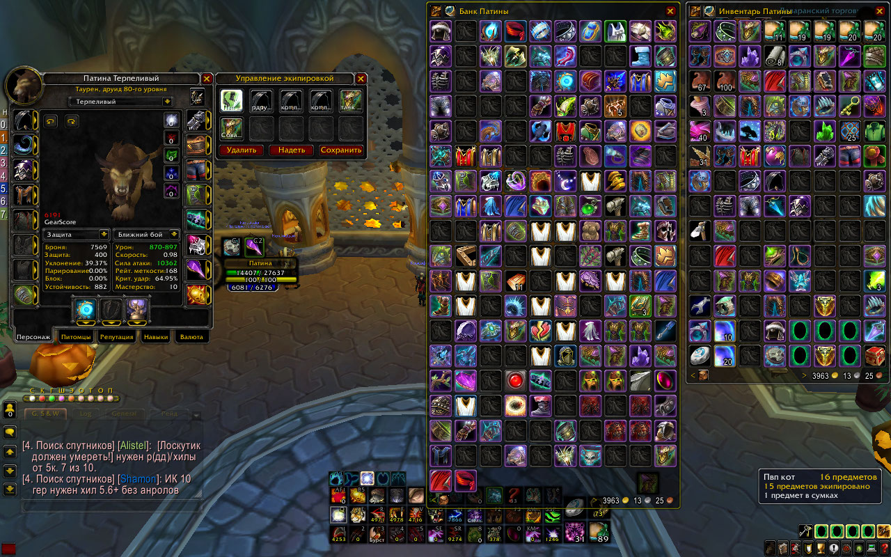 1. Патина, Друид, Орда, Ферал/сова/танк/Кот, в ПВЕ все 6.5+ ПВП 6к+.