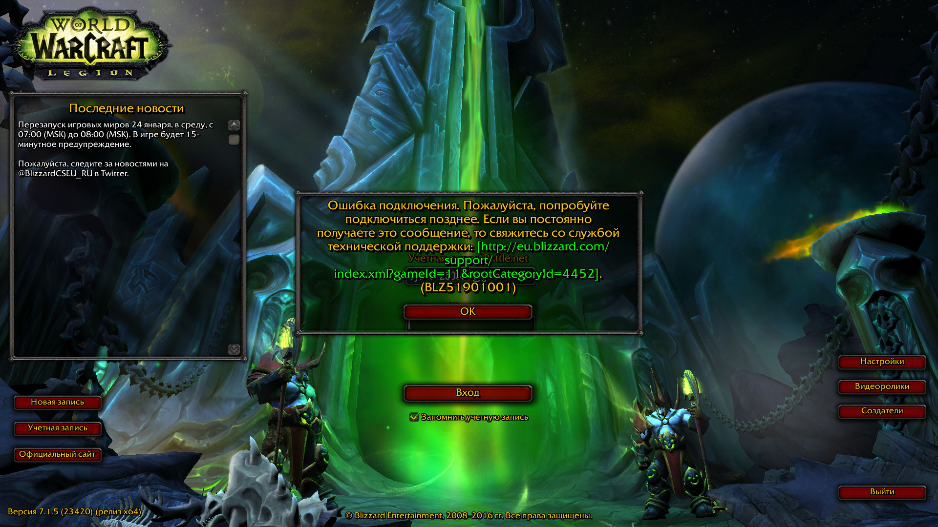 Сегодня я нечайно удалил ВОВ !! потом скачал!! И ВОТ ПРОБЛЕМА !! Я НЕ МОГУ ЗАЙТИ В СВОЙ АКК!!! ОШИБКА 1901001 ! ОШИБКА ПОДКЛЮЧЕНИЯ !!! Помогите !!! чот не могу понять в чом причина !!! раньше тоже такое было но у меня получилось востановить прежние файлы вов ! и оно стало работать !! а вот сейчас не получилось востановить файлы !! И не заходит !!! помогите