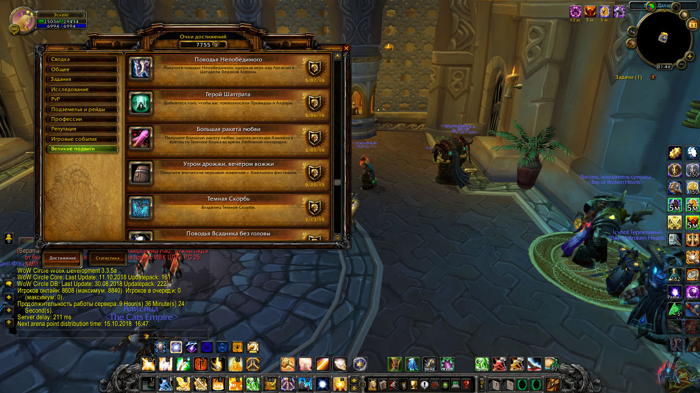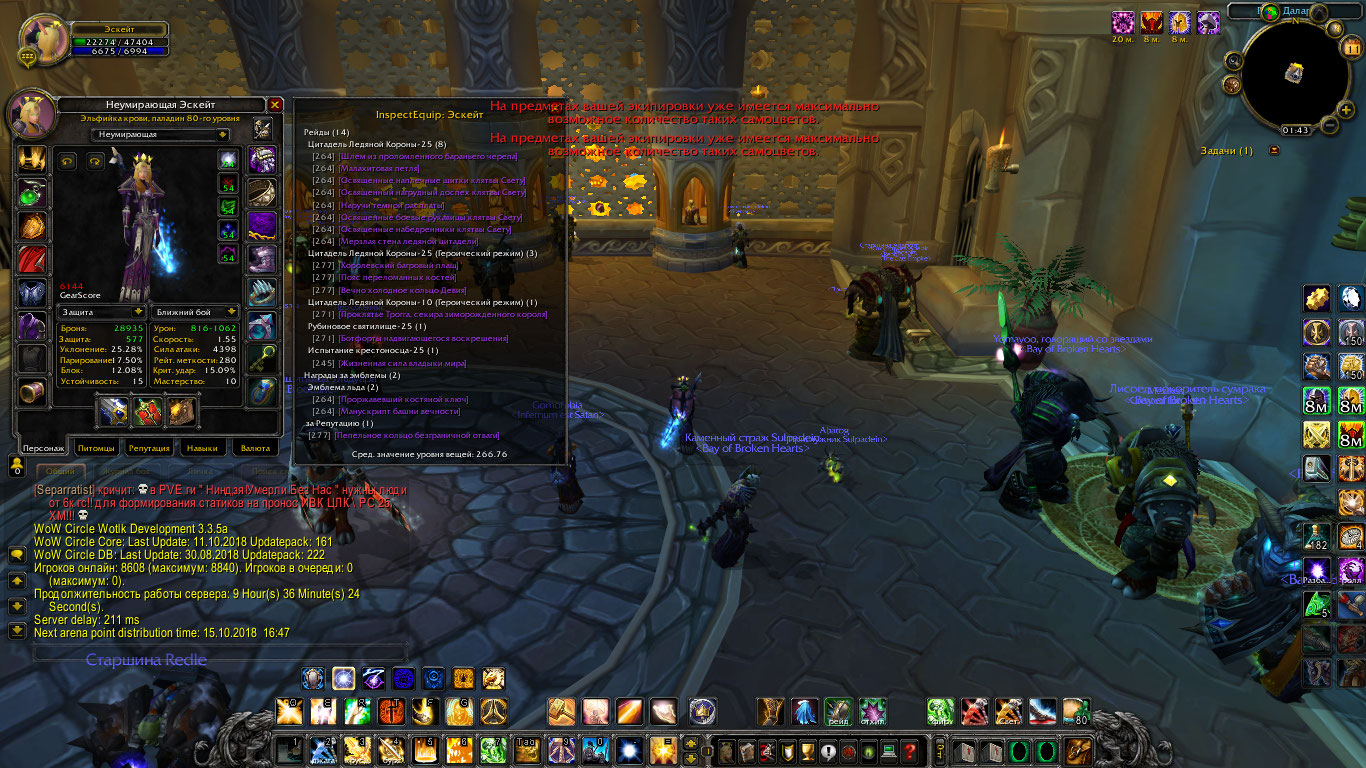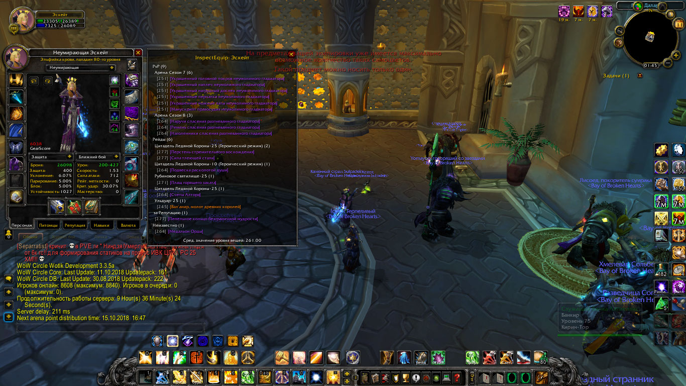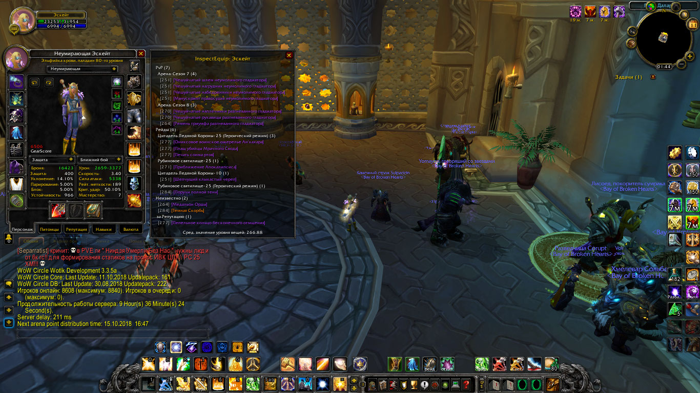 1. Эскейт, воин света, орда, 6769 пве ретрик, 6250 пве хил(валанир). , 6144 протик, 6506 пвп ретрик (есть плечи и кисти а8), 6038 хпал пвп (сугубо а7) 81 день онлайна