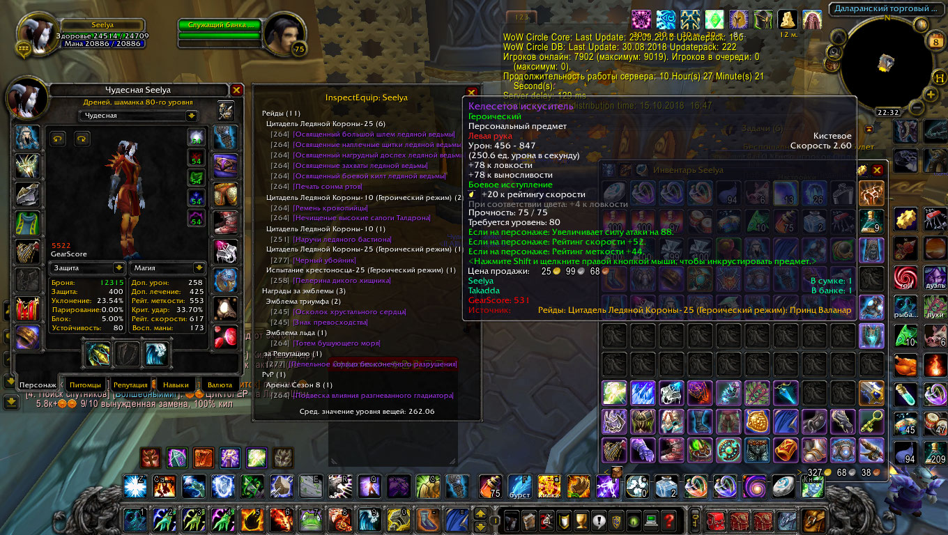 5.Отличный шаман хорошо хилит, так же хороший элем, есть шмот на энха в 6к гс(на скрине 2 пуху не одевал т.к переделал спек), есть ВАЛАНИР,непобедимый, много трансмута, вкачана инжа и алхимия+ кулинария и рыбалка, 6к ачив,если в лк нету значит показываю , пишите кому нужно всё покажу в игре.