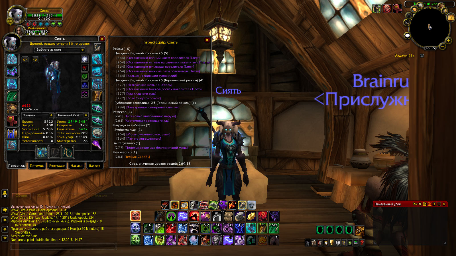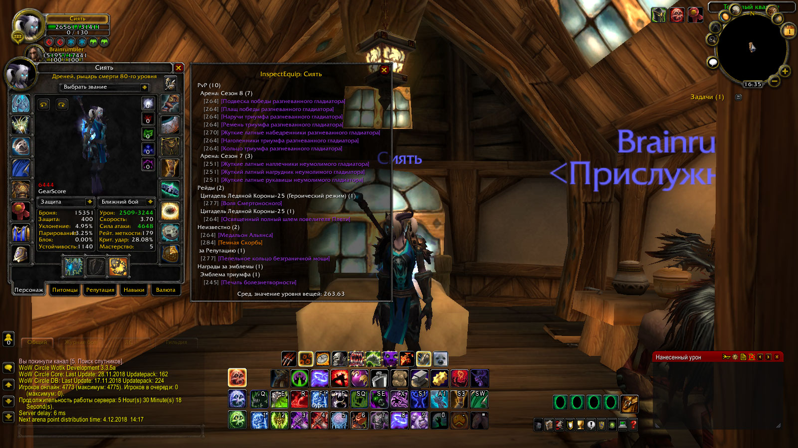 3. 100 дней. Имеется 7к ачив, есть 24 звания, так же 9 страниц маунтов, из которых редкие - Конь Ривендера, Небесный Скакун, Пепел, так же много других. Есть Сульфурас, и Громовая Ярость на транс. Профы - инжа + кузня.