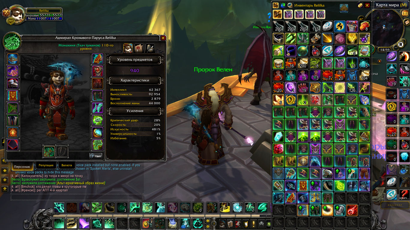 5. Другая информация;Топовый монах для разноса всего что движется.Есть 7 легендарок 2 бисовые на ВВ.Есть топ триня на хила с Аргуса порабащёного.Куски с АПТ.Есть возможность смены илвла и стат за счёт шмоток в сумках.