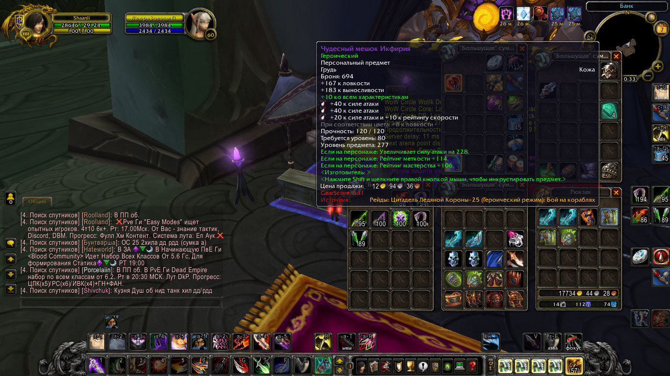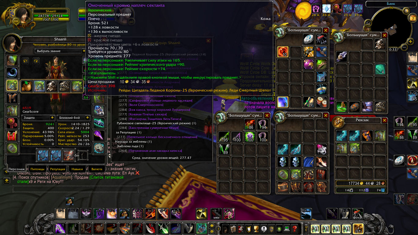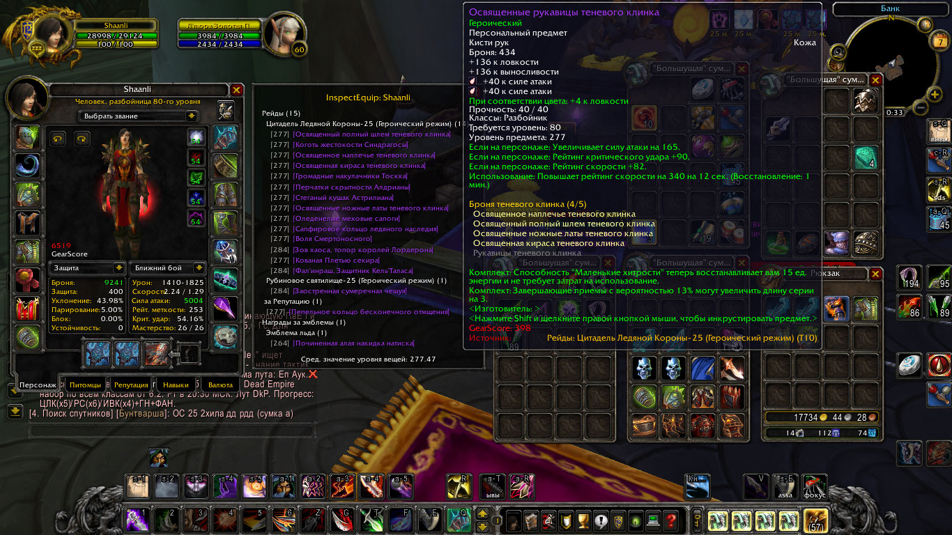 x100 aliance rogue Shaanli бисс комбат много гира под разные спеки (по 2 пака всех дагеров из цлк 25 хм,гир под хаст и гир под пве мути так же есть приговор ХМ череп ХМ и кольцо под мастери) выполнена ачива слава рейдеру ЦЛК 10 маунт непобедимый стоит персонаж в лк цена 1300+%