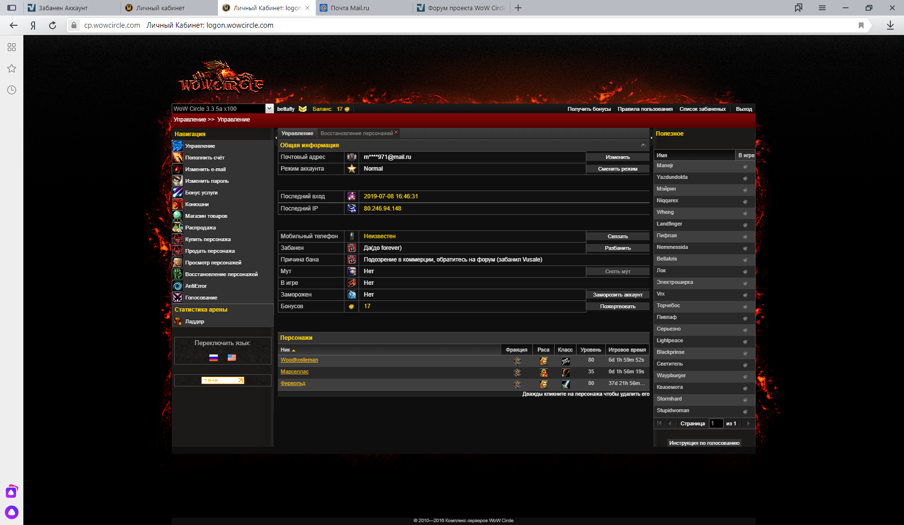 4. Был на работе неделю, до этого играл крайне редко, данные об аккаунте никто не знал. Был привязан телефон к аккаунту и за неделю приходила смс о смене пароля хотя я был далеко от компьютера, потом я приехал и сменил пароль на другой ( на всякий случай ) далее через некоторое время был забанен, хотя даже не играл. Прошу разбан.Вложение 779099Вложение 779100