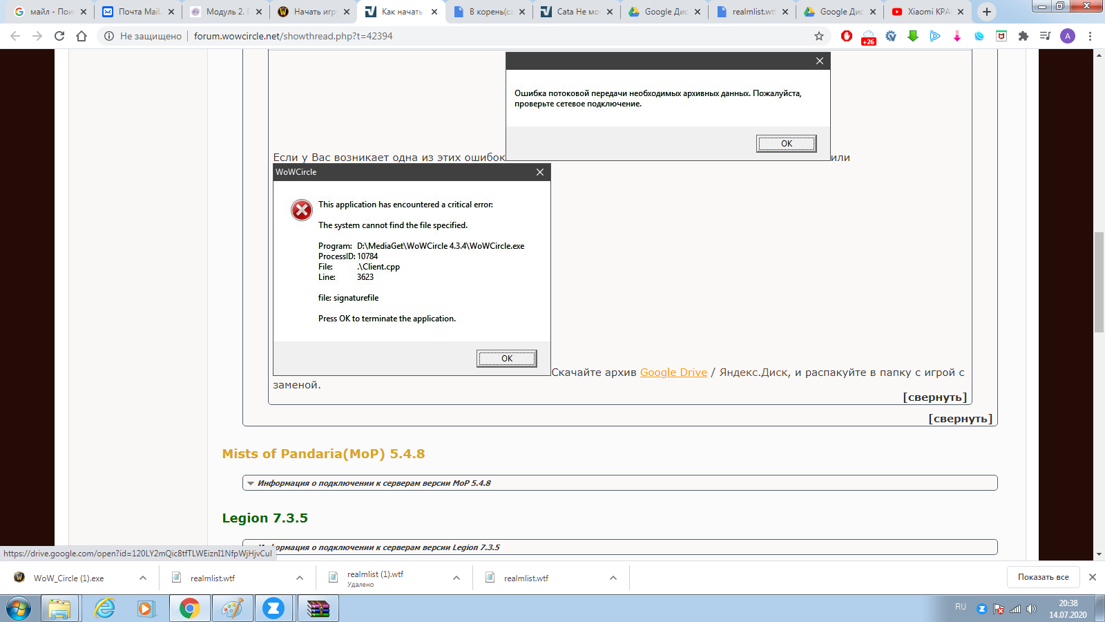 Скачал клиент каты по вашей ссылке другого клиента каты у меня нет поменял реалм лист как указано удалил указанные папки выдал ошибку которая указана ниже скачал архив поместил в папку с игрой с заменой снова удалил все папки кэша т.д. ошибка не уходит скачал WoW_Circle.exe попробовал через него ошибка та же и не уходит в чем проблема не пойму помогите. Ошибка кстати потоковой передачи необходимых архивных данных.