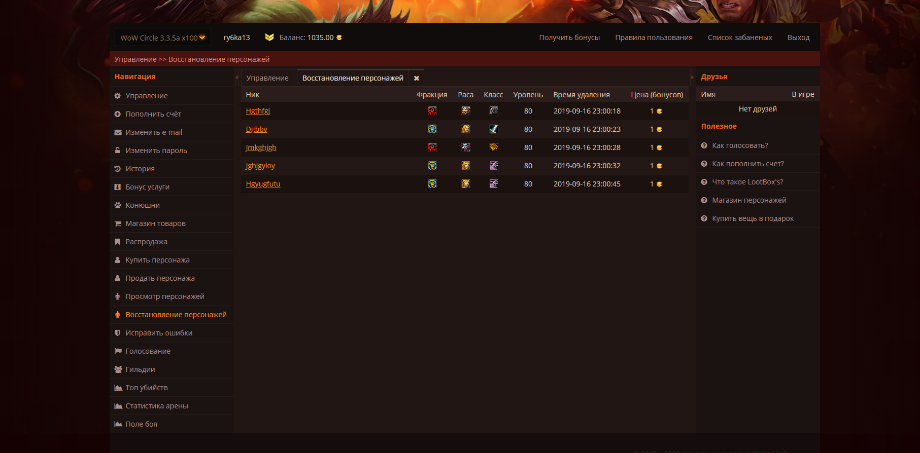5. Скриншот с личного кабинета со списком удалённых персонажей на вашем аккаунте