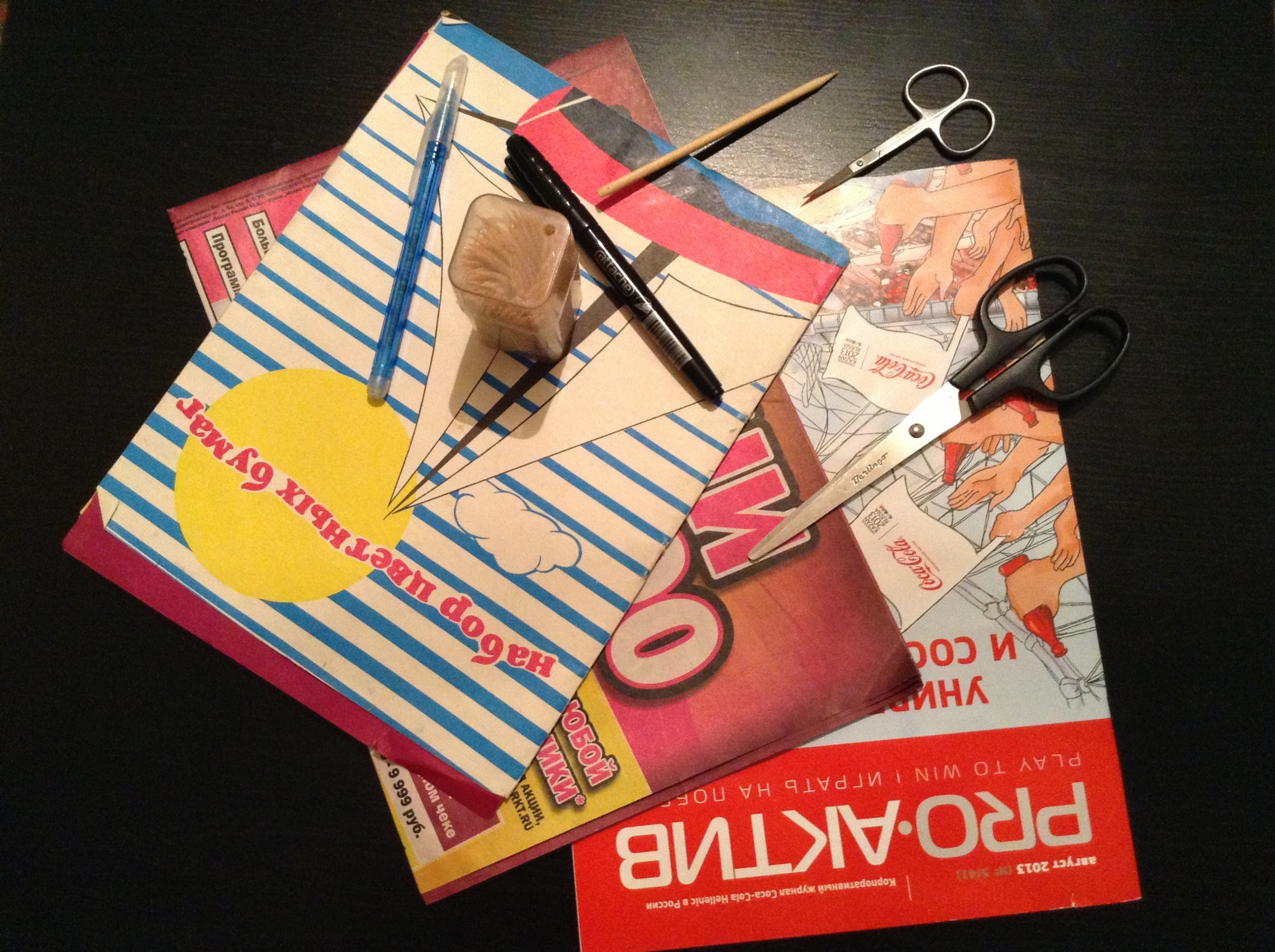 2.Материал: цветная бумага, зубочистка, лента, палочка для удаления кутикул, ножницы, журналы, маркер, фантазия, терпение.