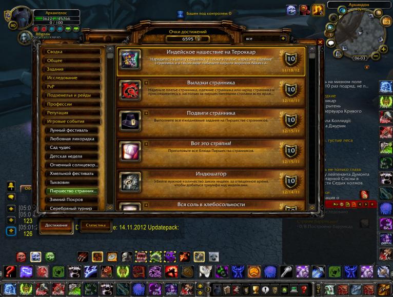 Название достижение Описание: достижение Работает Нужен прокачанный навык кулинарии 280+ Подвиги странника Для начала берем у ближайшего торговца Кулинарную книгу и учим из нее все 5 рецептов. Затем нужно пройтись по всем столицам и купить Тельдрассильский батат 20 штук - у торговца в Дарнассе, Спелая элвиннская тыква 20 штук у торговца в Элвинском Лесу, Кислая клюква из Болотины 20 штук у торговца в Дун Мороге,Мед 100 штук у любого торговца пиршества странников и Осенние травы 60 штук, так же у любого торговца, а также сделать Хлеб с пряностями. Теперь, из всего этого мы можем приготовить нужные для задания блюда: Запеченная индейка для Слишком мало индеек,