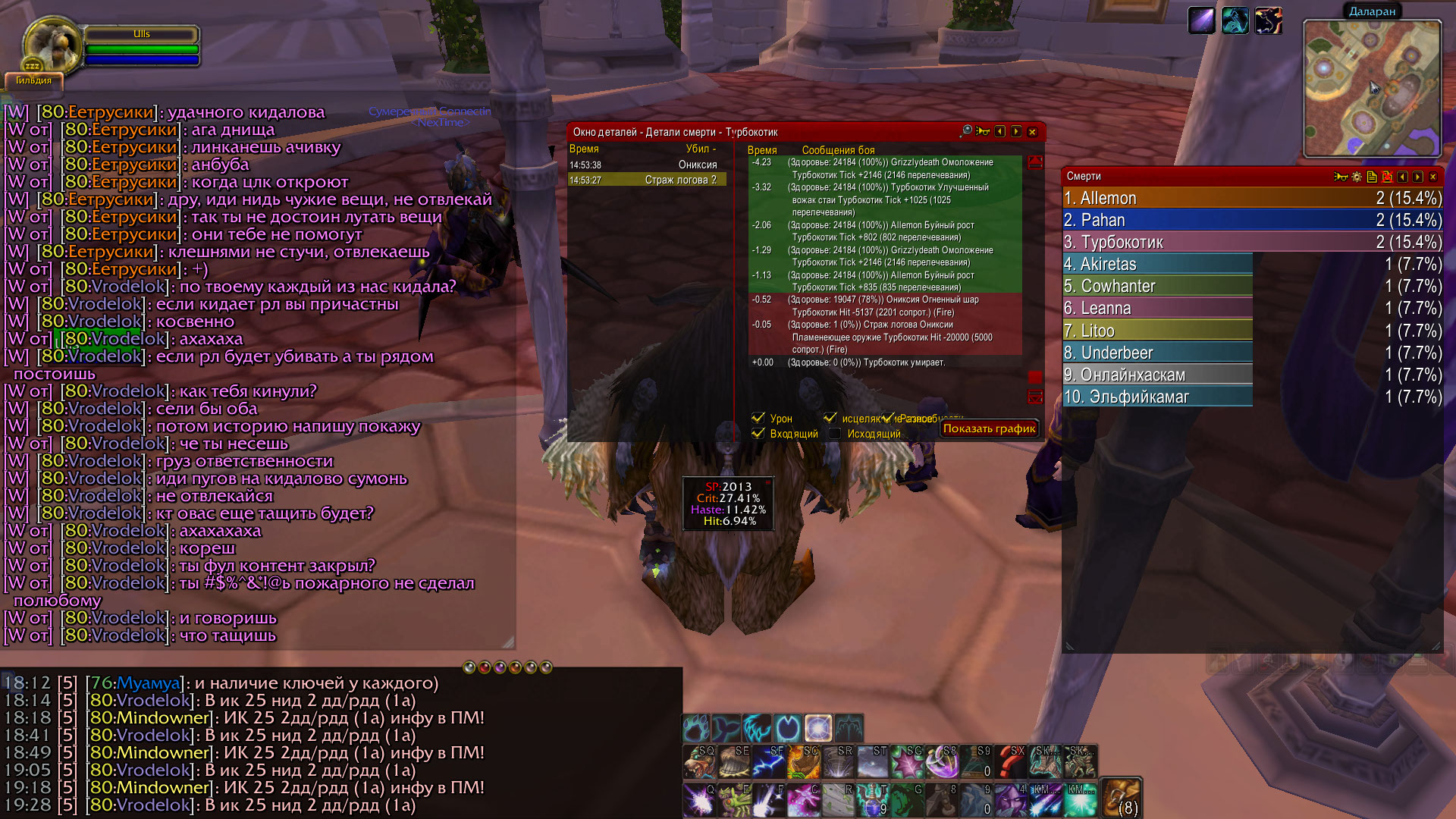 Время около [14:53:27] Появляется треш. а танк все еще бежит, агрит и ставит. Уже несколько секунд отдаляют его от цели, когда неудачно повернувшиеся стражи рассекают двух игроков: паладин Турбокотик и шаман Pahan падают смертью храбрых одними из первых вгрызаясь и драконидов! Совенок Ulls не растерялся и быстро БРнул (воскресил в бою) паладина Турбокотик, который так же оперативно прожал "воскреснуть", ой зряяяя... так поспешил.