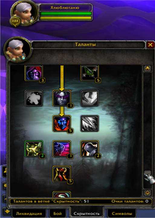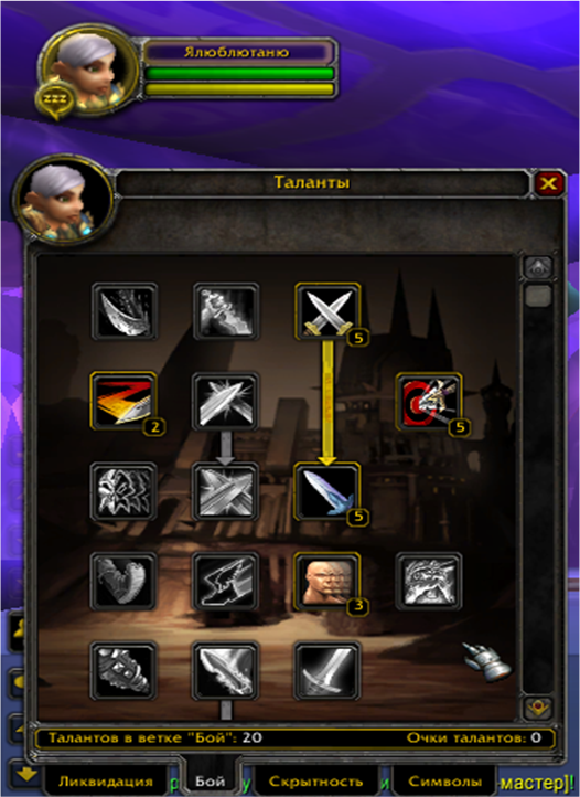 Также надо два кинжала в правою руку один на берсерка второй на чернуюмагию и менять их в бою После танца теней берешь кинжал на черную магию на 1-4 ссекунды прок и назад меняешь. и ещё можно шаг сквозь в тень не вбивать в макросы но так ещё труднее.