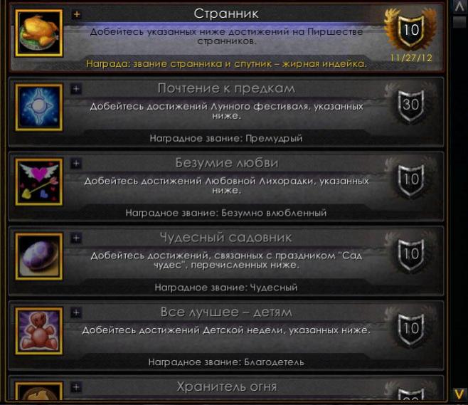 Ежегодно с 18-го по 25-е ноября проходит праздничное мероприятие Пиршество Странников. При завершении всех заданий и получении всех достижений указанных в критерии Странник, вы так же получите наградное звание Странник, оригинального питомца Клетка с индейкой, а так же еще на один шаг приблизитесь к выполнению достижения Долгое и странное путешествие и получению заветного дракона. Всего достижений девять, четыре уникальных для каждой фракции, а пять общих. Более подробно смотрите в таблице ниже.