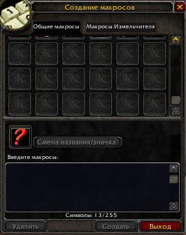 Вы видите ячейки для макросов, которые вы можете заполнить, две закладки — «Общие Макросы» и «Макросы Измельчителя»(Измельчител — это персонаж, на котором я создаю макрос). В самом низу есть кнопка «Создать». Нажав её, откроется окошко, где вы можете выбрать название для макроса и значок: