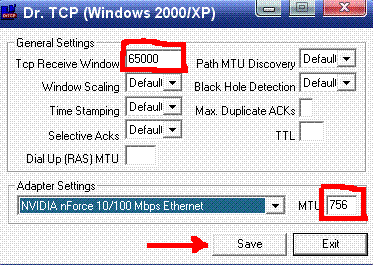 2. Запускаем DRTCP. В выпадающем списке находим нужную сетевуху (если их несколько). В поле "Tcp Receive Window" - 65000. В поле "MTU" - 756 (это моё значение, у Вас оно может отличаться). Сохраняем настройки - "Save".