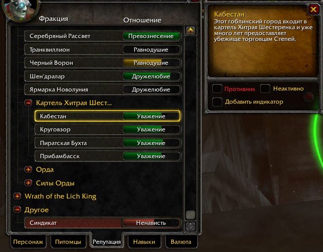 Если хотите, можете долбить синдикат для повышения репы, но дают там мизер и прокачать до Превознесения низя, поэтому советую брать квест Принести лари у Фахрада в Поместье Черного Ворона. Не знаю как на оффе, но у нас его можно взять сразу при равнодушии.