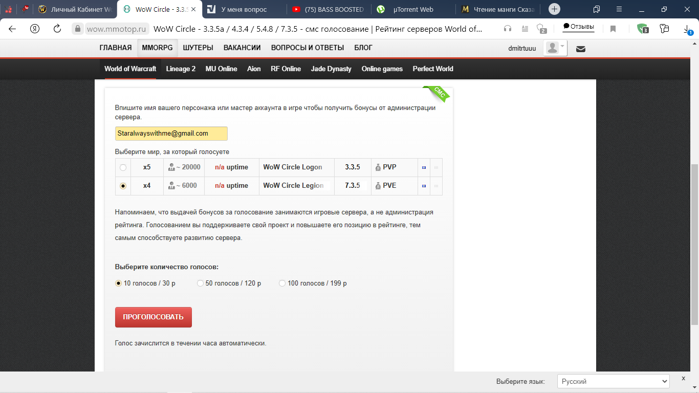 Добрый день, я попробовал зачислить бонусы с помощью сайта mmotop.ru, где мы голосуем, оплатил там 10 голосов, было написано, что в течение часа бонусы зачисляться на счёт, но они так и не пришли, таким способом нельзя начислить голоса? Вы не работаете с этой платформой в таком ключе? Только бесплатные голоса?