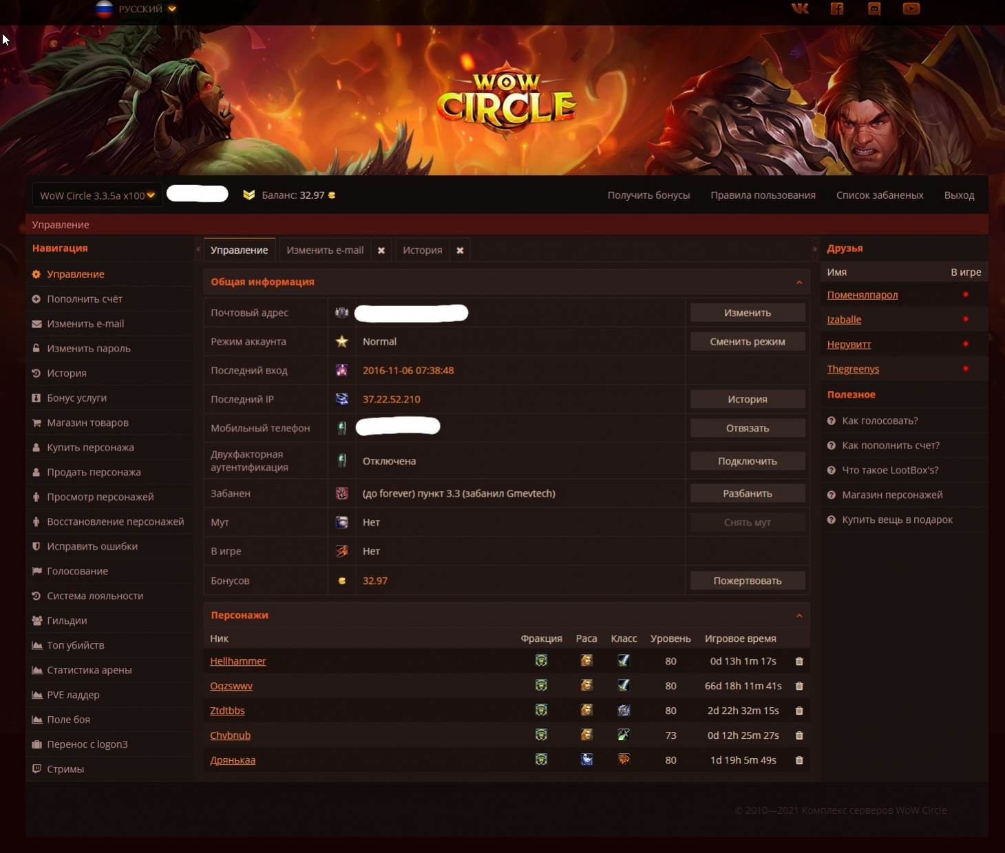 Немного поменялись обстоятельства, я смог восстановить пароль, но аккаунт забанен. На нём почта я так понимаю стоит robot@wowcircle.com, и поменять я её не могу, так как акк забанен, скрин приложу.
