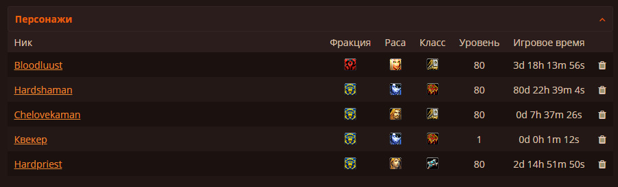 1) Hardshaman- шаман/дренейка, Bloodluust-Паладин/Эльф крови(орда), KBeKeP- шаман/дренейка, Hardpriest- Прист/Человек, Chelovekaman - паладин/человек.