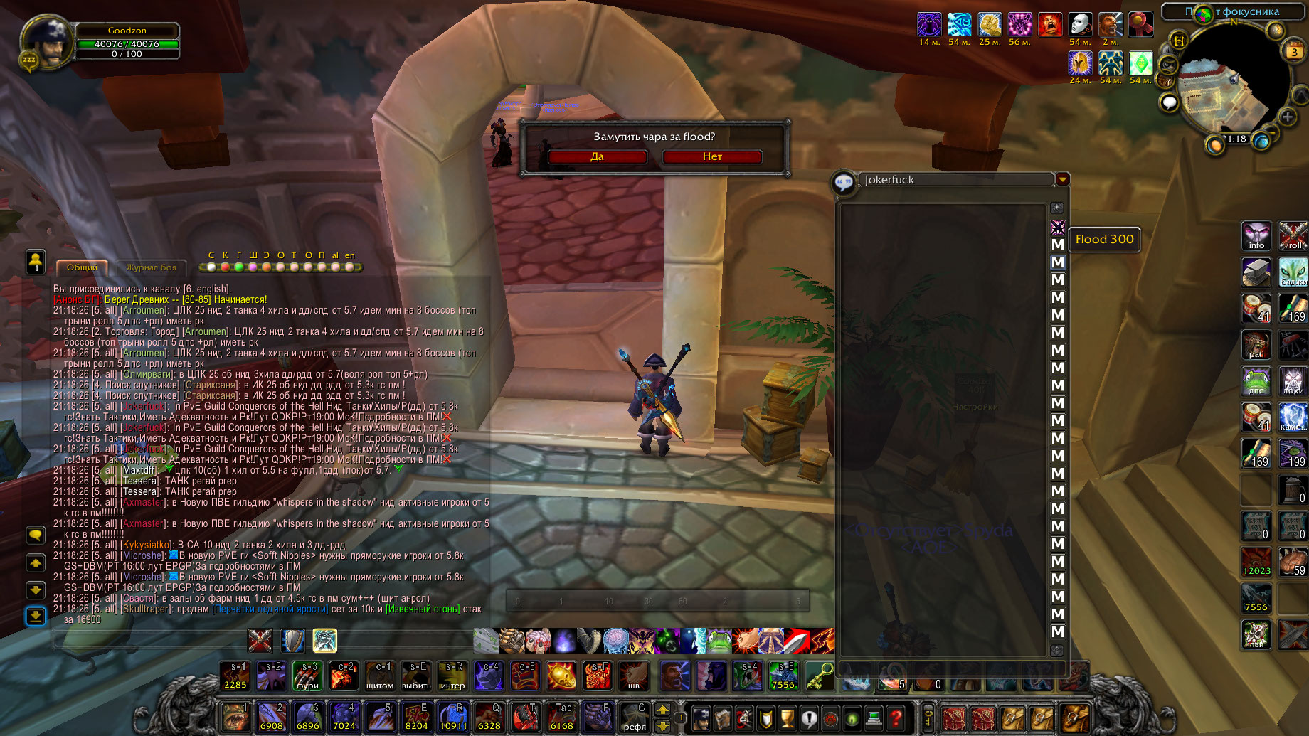 3. Флуд - отправка 2-х одинаковых, либо более 2-х разных сообщений в течение 10 секунд, К флуду приравнивается многократное повторение друг за другом фраз, слов, букв(символов) в одном сообщении, а также бессмысленный набор букв(символов), чрезмерное злоупотребление эмоциями - от 60 до 1440 минут;(Взято из Темы "Критерии банов/мутов на реалмах logon" Написанным "Ice"