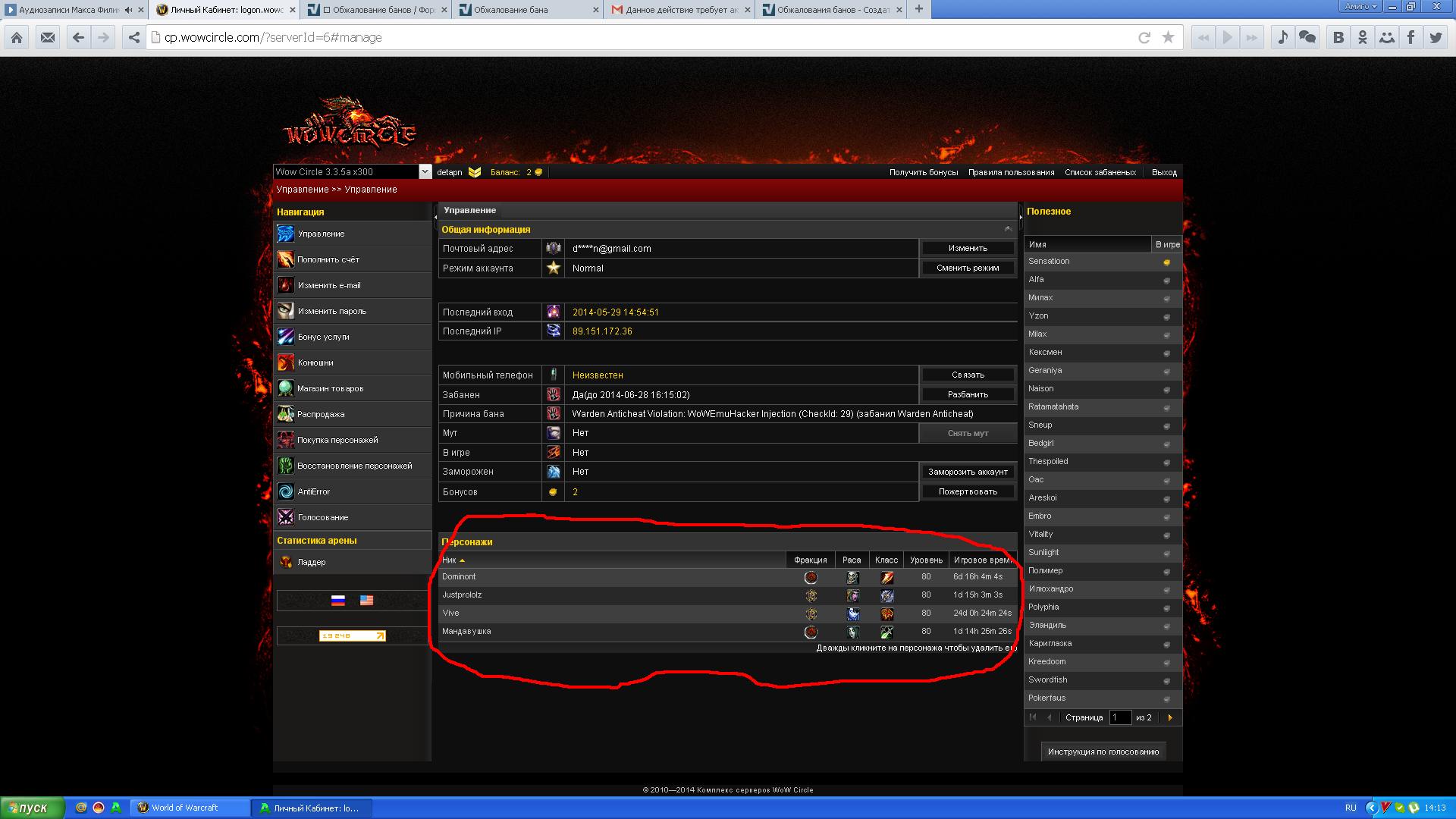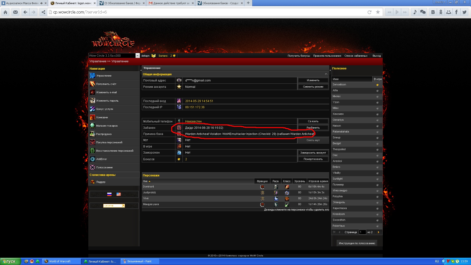 2.Причина:Warden Anticheat Violation: WoWEmuHacker Injection (CheckId: 29) (забанил Warden Anticheat)