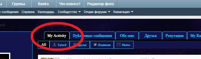 Эта вкладка открывается сразу. Она черным даже выделена. У нее (активити) есть под вкладки: Олл (открыт сразу, там видны все сообщения написанные Вами и Вашими друзьями), Ваш ник (именно сообщения, которые Вы писали), Подписки (темы, в которых Вы писали) и Фото.