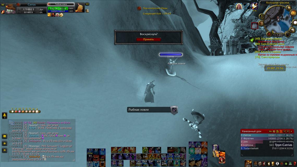 Данный игрок в течение 20 минут моего наблюдения бесперерывно рыбачил, не отвечая ни на одно мое сообщение, 3 раза умер. На первом скриншоте, после моей смерти дк начал его бить, но паладин продолжать закидывать удочку. На 5 и 6 скрине показано, как меня убивают, а паладина не трогают, хотя оло - пвп зона, и он уязвим. Скорее всего, его защищают от лишнего внимания, я умер рядом с ним 3 раза.