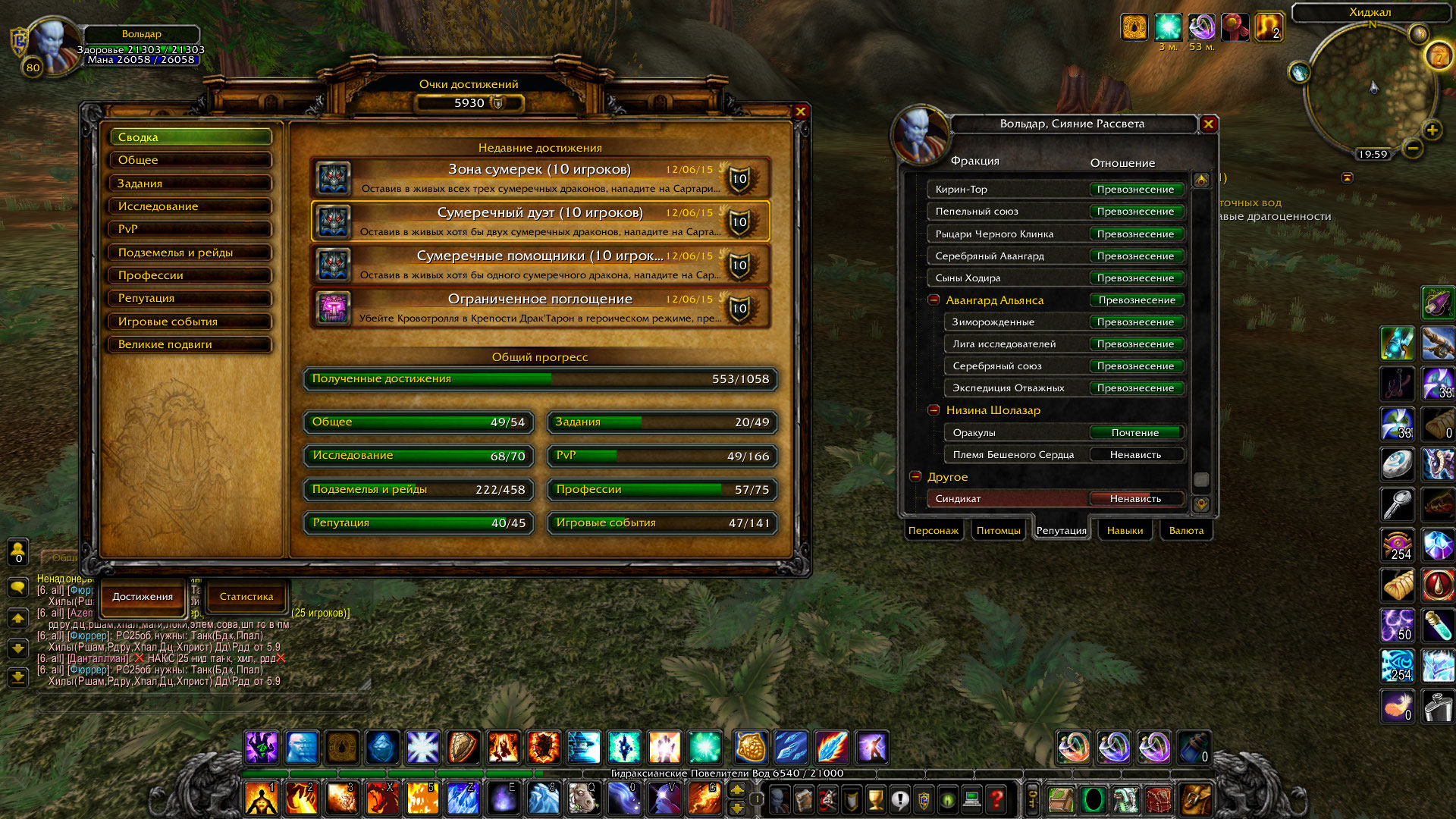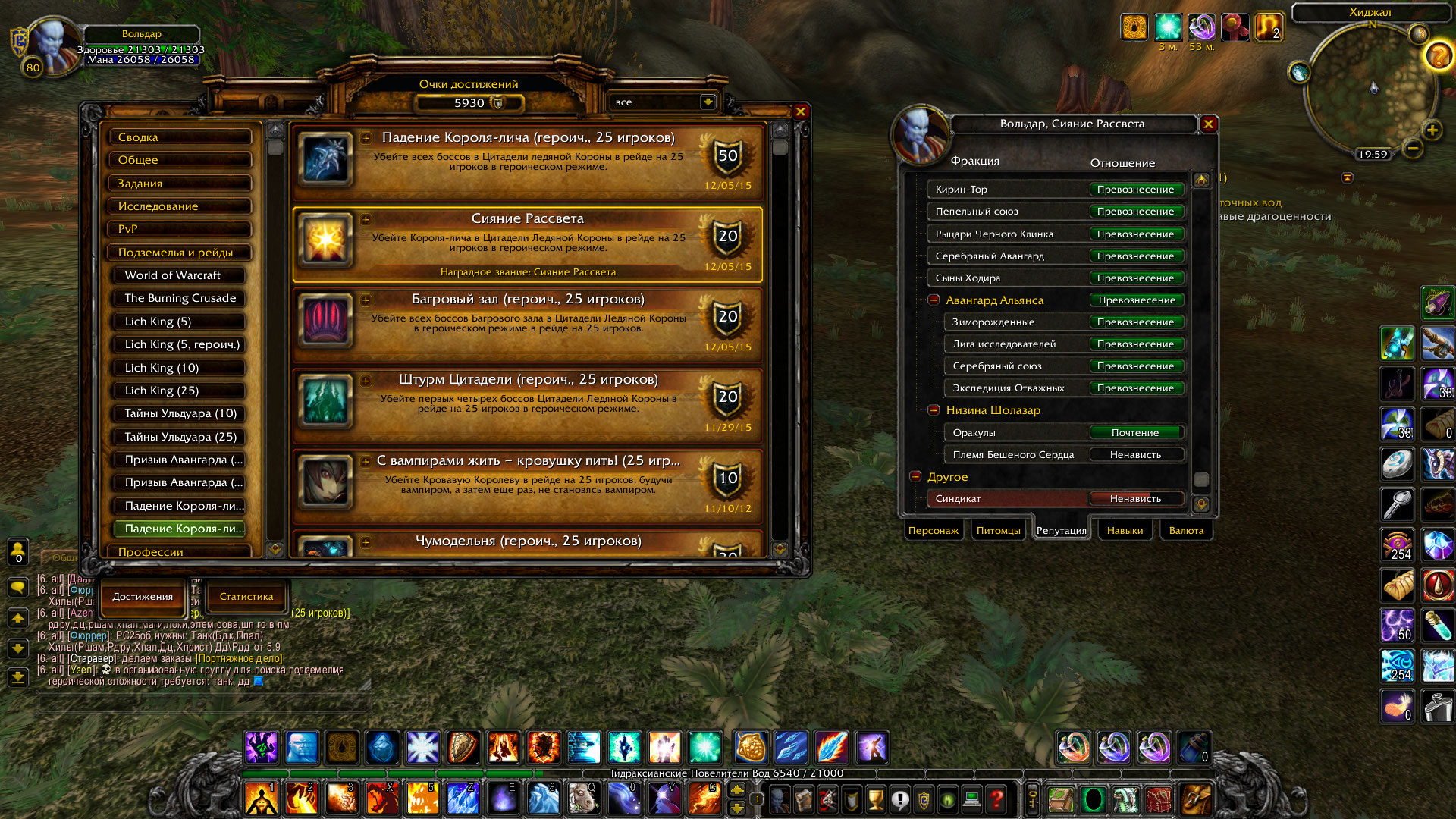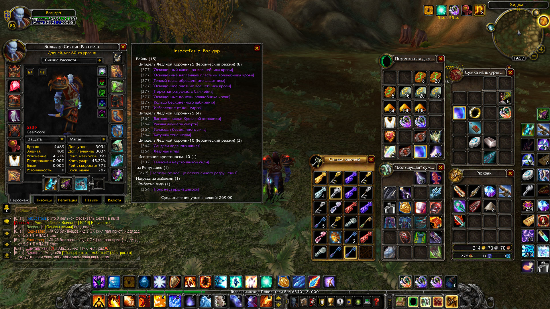 5)Маг супер. Правильные билды это минимум, что вы на нем увидите. Почти 6к ачивок. Шмот 3 из 5 Т10 гер, Талик ЦЛК 25. На персе есть 8 страниц петов среди которых Непобедимый(не донат), Багровый конь, Затерянный протодракон. Анжинерский Чоппер, куча всяких драконов и скатов Пустоты, Тундровый мамонт путешественника. Куча редких питомцев(мелких). Прокачаны профы Травничество(в банке куча трав, личецвета) и Алхимия(все рецы). Званий тоже много и среди них Сияние Рассвета. Репутация почти у всех группировок и групп - Препознесение. Хотя все, что я вам описал есть и так на скриншотах. Магу то БИСа еще расти нужно, но в топ по ДПс вы уже будете попадать всегда. В пвп есть куда развиваться, даже представить вам сложно, сколько фана принесет фаер на арене и в 1х1.