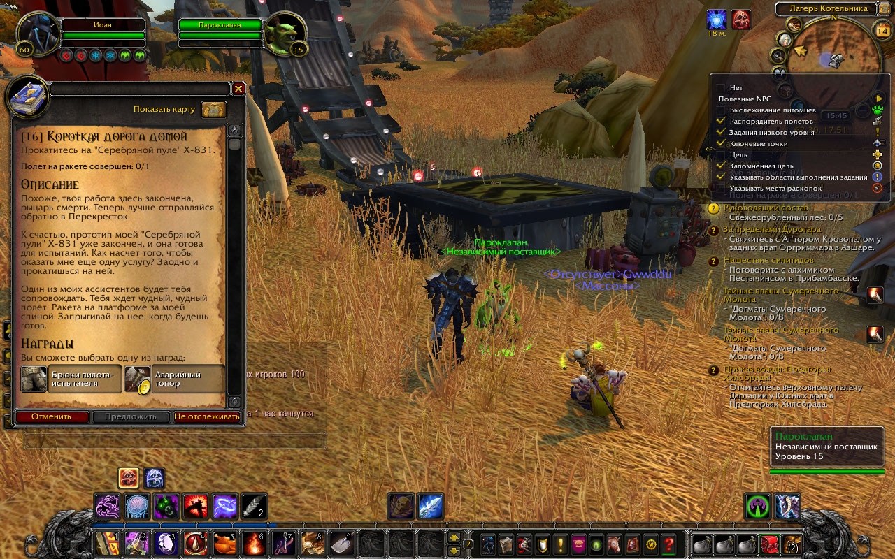 2. Задание должен довать Пароклапан <Независимый поставщик> (http://ru.wowhead.com/npc=3442), а окончание у Дарсок Быстрый Нож (http://ru.wowhead.com/npc=3449) ракета на которой должен быть, совершён полет, отсутствует.