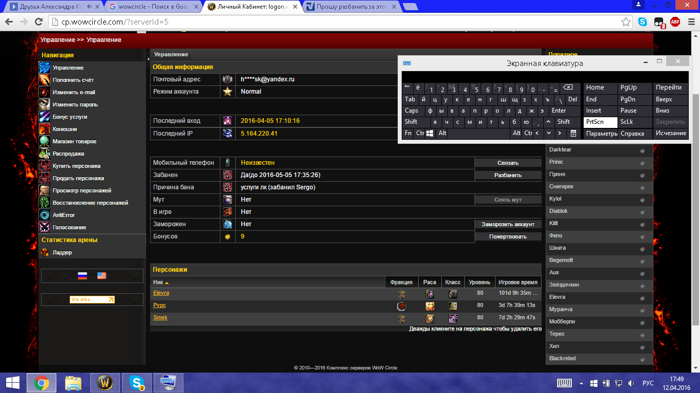 3)3) за 6 лет игры на этом сервере,никогда ничего подобного не делал.никаким распространением не занимался и т.п. Тут какая-то ошибка. всегда играл просто для своего удовольствия,а не чтобы кому-то какую-то гадость сделать. в добавок ко всему я кое что вспомнил! я пользуюсь аддоном WIM,который сохраняет все истории сообщений между мной и другими игроками! я пытался писать этому шаману с другого аккаунта,он мне не отвечает и сразу оффается!так же через этот оконный аддон решил тыкнуть на настройки,увидел что все мои переписки до самого последнего сообщения сохранены! так же я могу и с друида своего сделать подобные скрины и доказать что ничего я ему не продавал и не писал ничего подобного! прошу рассмотрите заявку сноваБезымянный11.pngБезымянный12.png
