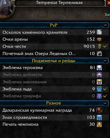 5. бис пве шп, предбис дц\холи. 3/5а8 на дц, топ трини гер, 2/5а8 шп. Небесный скакун, непобедимый, прото в айронскине, 5 страниц маунтов, фул инча и талор, фан шмотки типа резной идол, гордость гномгерана и тд, 17 званий 5к ачив, дохерища шмота на трансмут, кулинария рыбка и тд