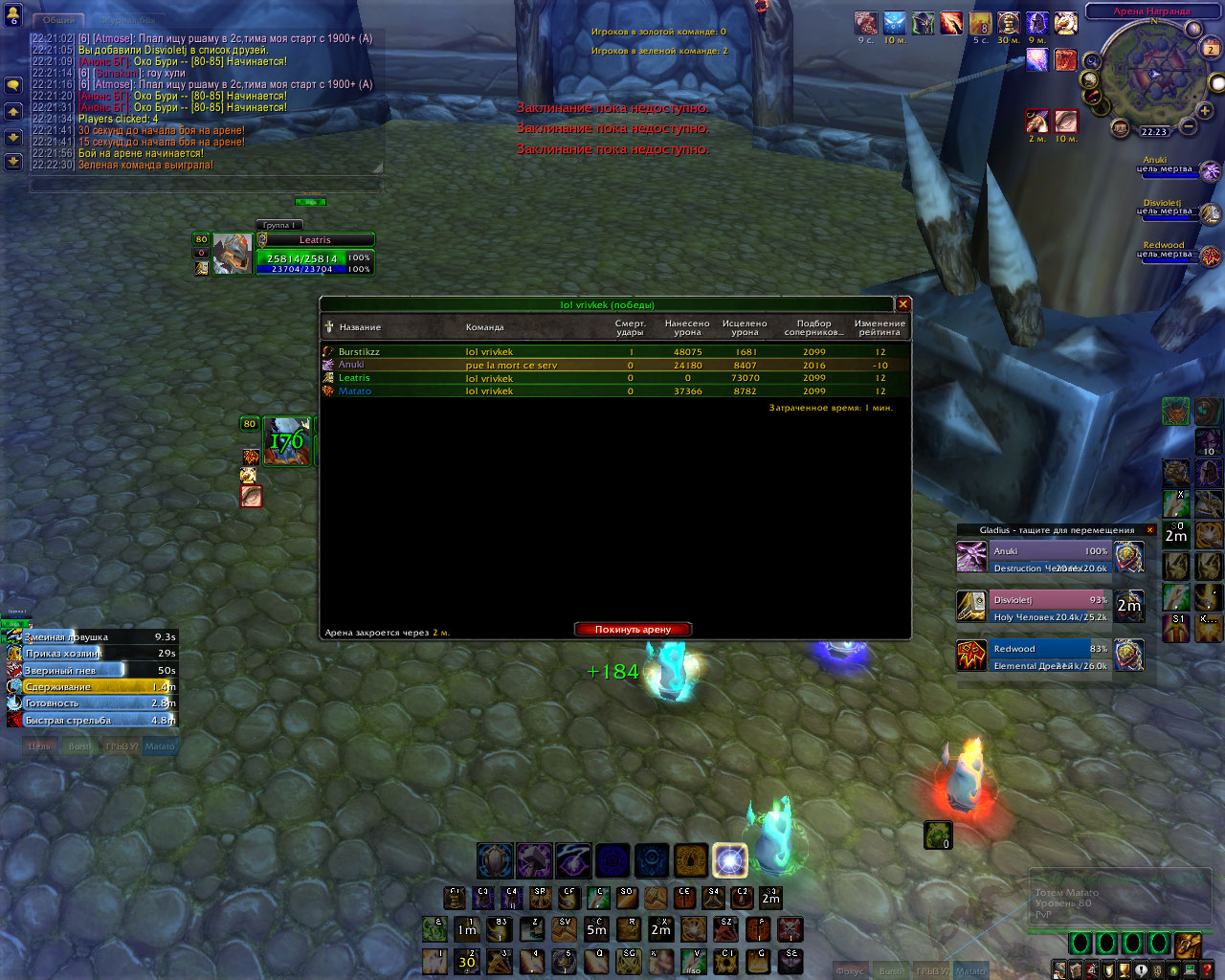 ;D а против энха то мне зачем кнок?слаер забущеный дурачек, который от меня по кд получает,что магом, что шаманом, что локом, а вы слили на 1 тиму))) сливали примерно на 2.1, ночные ривалы.вы убили нас за сек 10 после открытия, потому что мы прослакали, вот я и спросил зачем такое скринить. Вы начали лить ещё на 2060 примерно так.