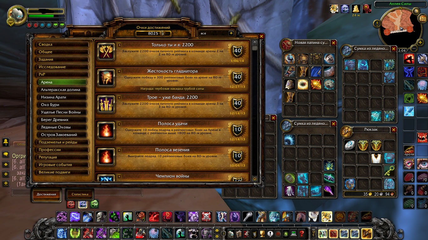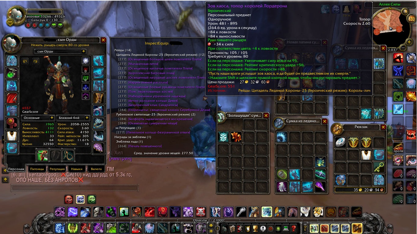Забанили прошлую тему за капс (лол), вообщем дк бис пве ( анхоли фрост танк ) и пвп фул а8 + бис обвес , 9к+ ачив , 9 стр маунтов, более 20 званий включая Сына Орды ) в банке куча всякой всячины + трансмут... Саоме главное что он не разу не доначеный.. 80 дней на нем отыграно.