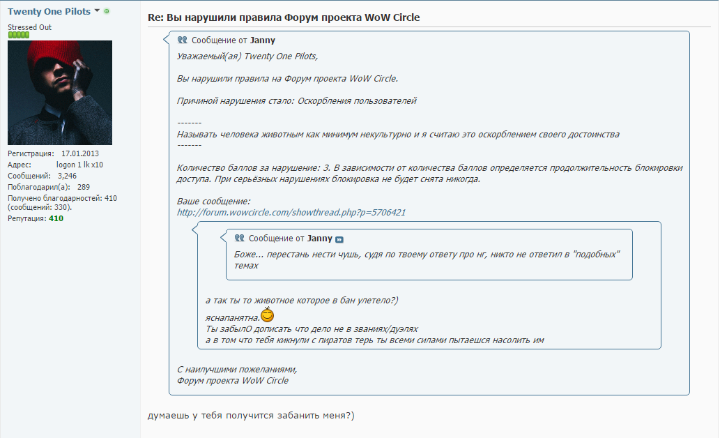 Уважаемый модератор, прикладываю скриншот из лички с угрозами и ощущением безнаказанности данного игрока: