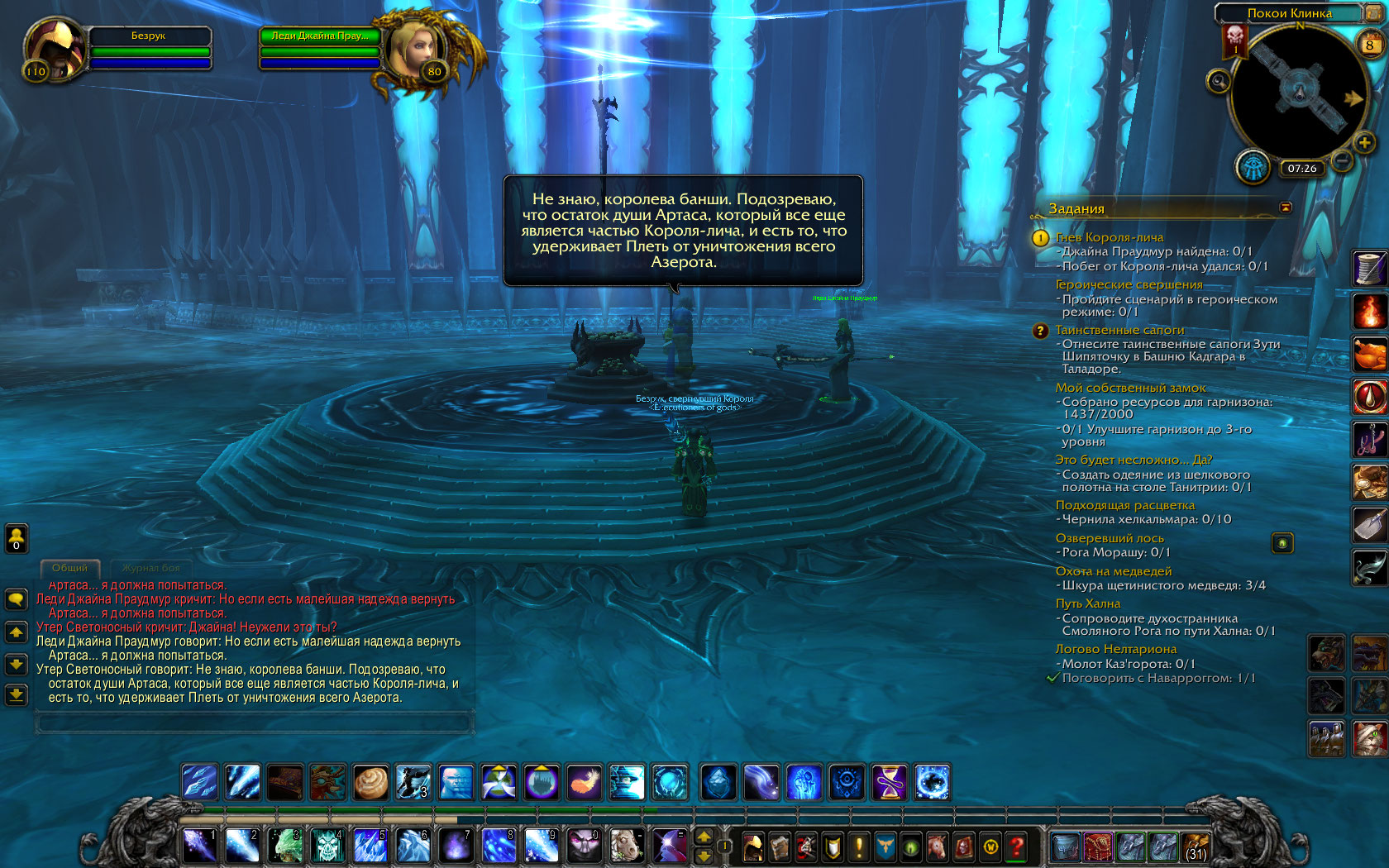 - При диалоге Утера и Джайны, http://ru.wowhead.com/npc=37225 может использовать фразу, предназначенную для Сильваны и наоборот, если взять Сильвану. (на скринах)