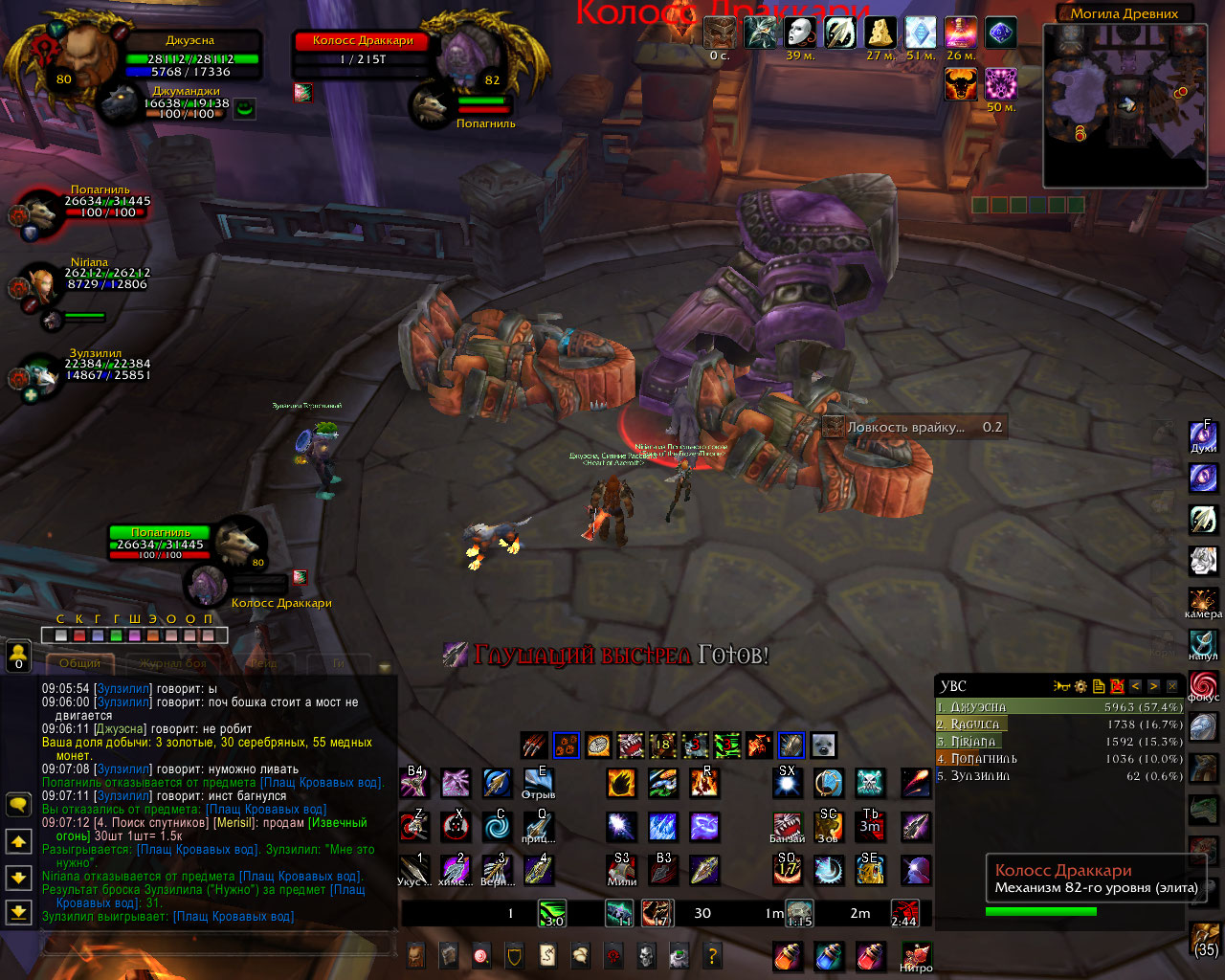 Сегодня обнаружил такой баг: в Гундрак босс - Колосс Драккари тупо не убиваем, в следствии чего, инст не проходится, т.к. юзнуть около него переключатель не представляется возможным. После начала боя с боссом, когда появляется элементаль, он тут же изчезает, при этом самого Драккари можно бить, но доведя до 1хп, он дальше не убивается, а тупо ходит за танком. Собственно скриншот далее:WoWScrnShot_081217_090718.jpg