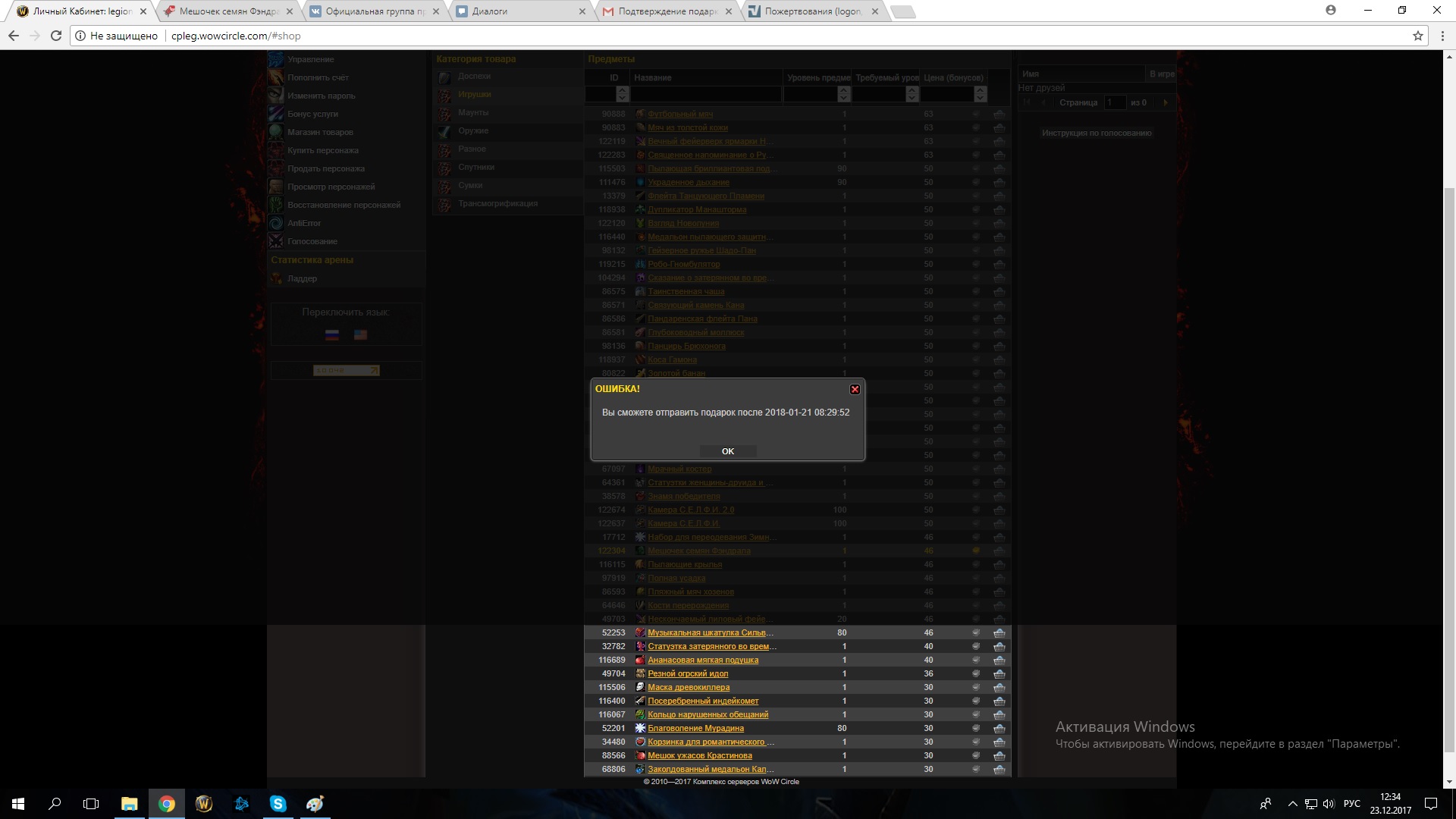 сервер легион , отправил вчера подарок на ник Dontnik http://ru.wowhead.com/item=122304 эту штуку досихпор не пришло , попытался сегодня отправить снова и вылазит такое подарок2.jpg ап