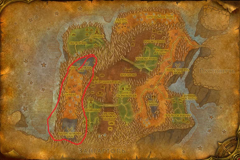 Ну а тут у нас вообще огонь. Делается эта примочка из http://wowroad.info/?item=32576 и http://wowroad.info/?item=32569х10. Они фармятся в локации Острогорье в зоне, отмеченной красным на карте: