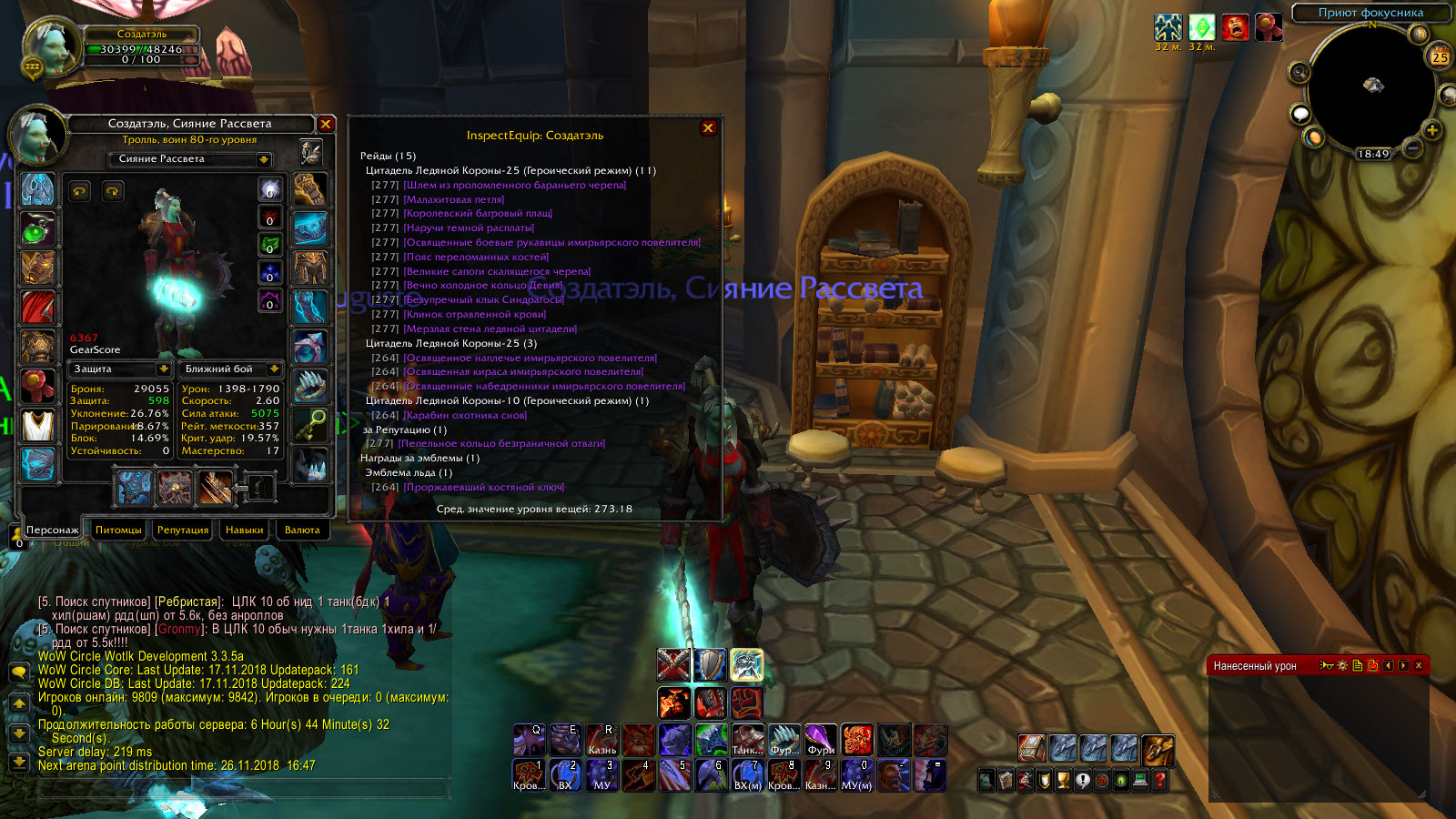 2. Скрины персонажа (не менее трех!!!), на которых видно ваши вещи, открытые сумки, достижения и т.д., с командой .server info (Обязательно) WoWScrnShot_112518_174818.jpgWoWScrnShot_112518_174839.jpgWoWScrnShot_112518_174855.jpgWoWScrnShot_112518_174954.jpg