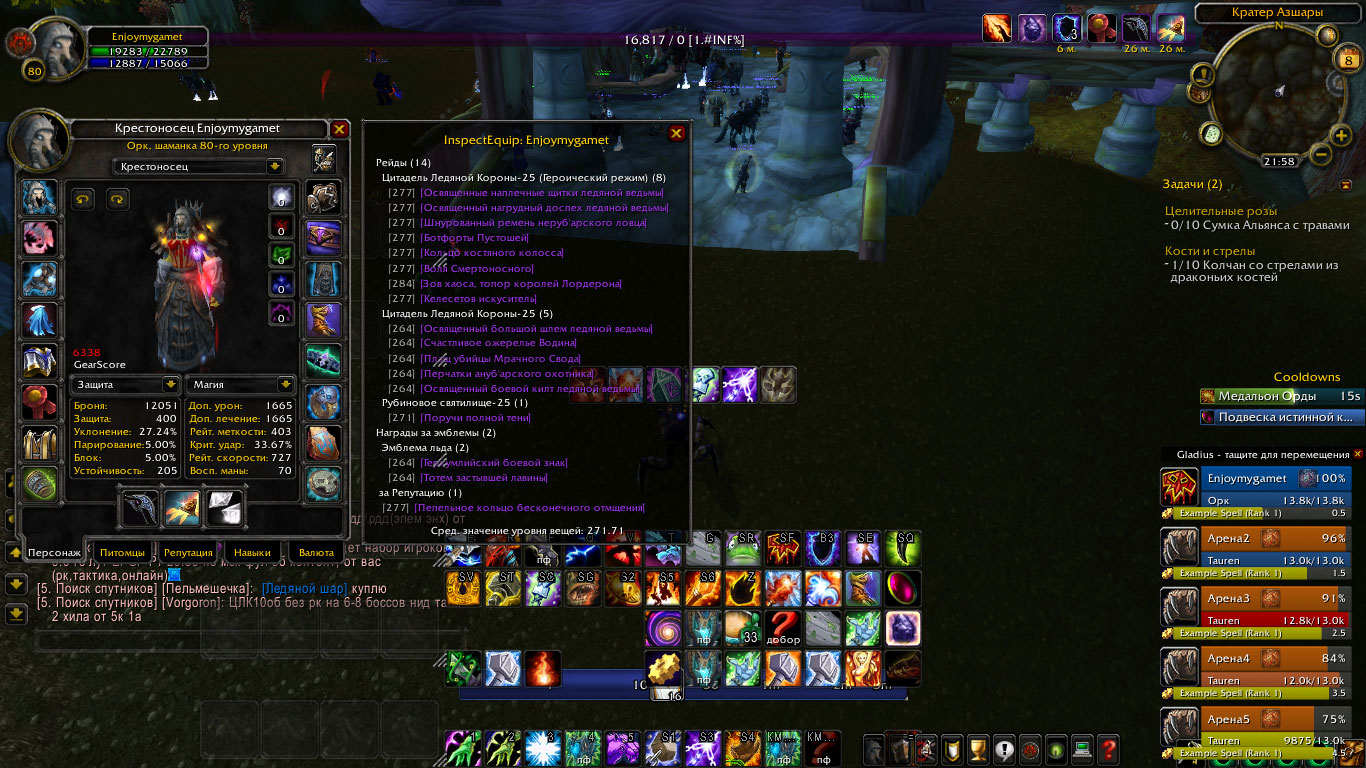 Скрины персонажа (не менее трех!!!), на которых видно ваши вещи, открытые сумки, достижения и т.д.,