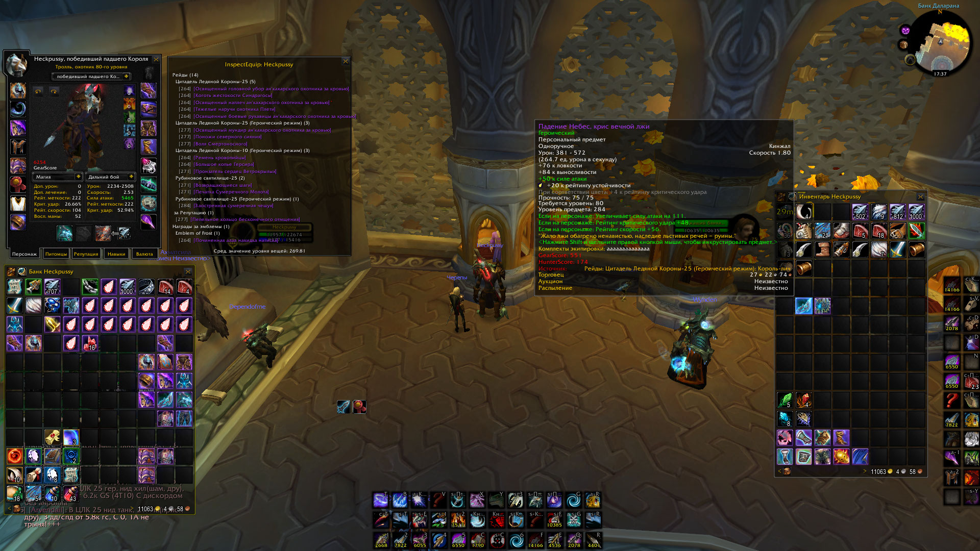 3) Предбис пве хант, 284 чешка и 277 воля, арбалет с цлк 10хм, бисс штаны, 4т10, одно 277 илвл(нагрудник), так-же присутствует большое количество 277 шмоток на ханта, крис 284, грудь 277, топор 277 с кораблей. Присутствует смена фракции и никнейма.