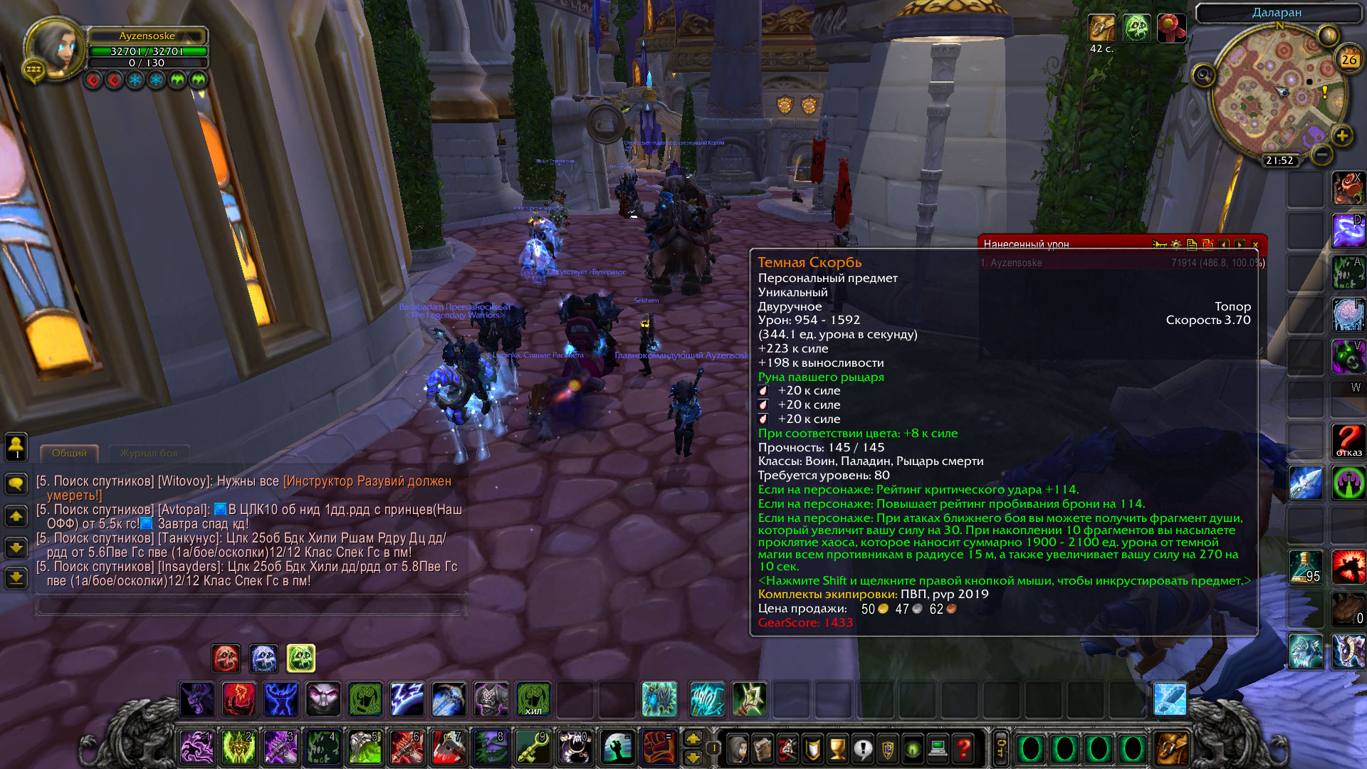 ник Ayzensoske, фракция альянс хуманша, есть все от пвп до пве! просто скажу по пухам тут т1 т2 шм бринтроль для фроста как пвп так и пве!" фул а8 дк с т2! 1550 реса !