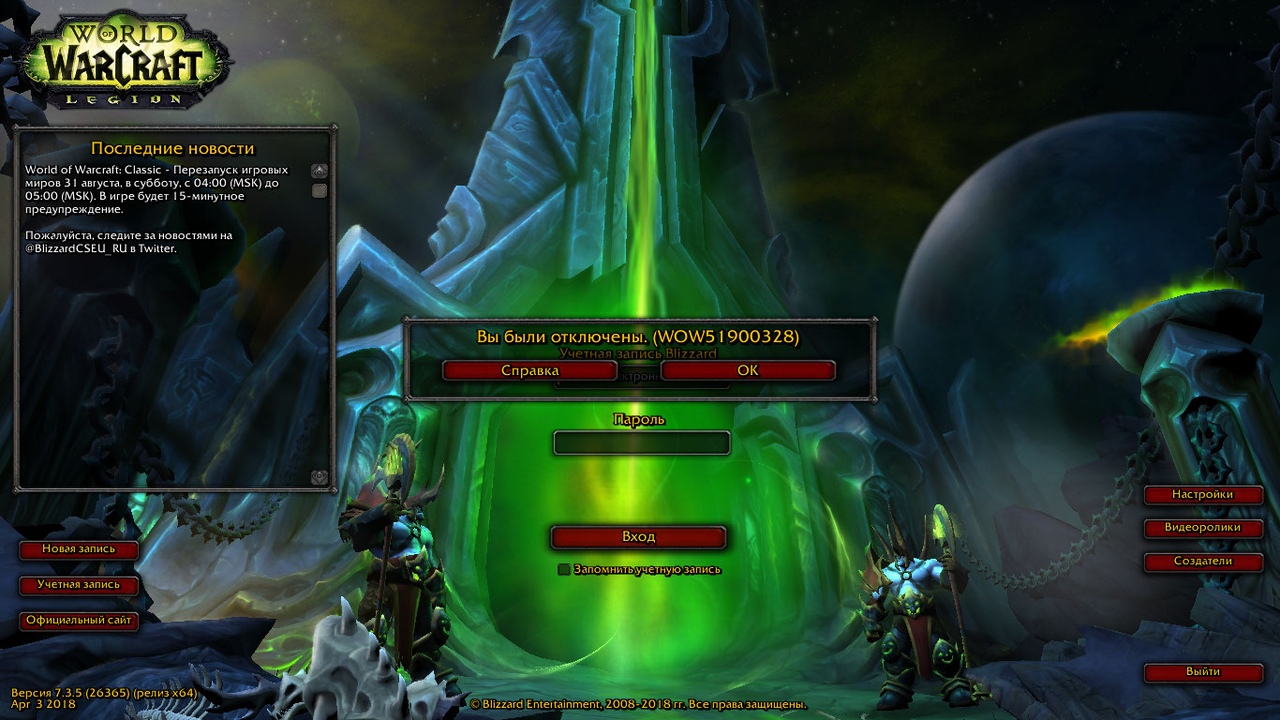 Играл себе играл качал ДЦ, резко дискануло после чего не могу зайти в игру. На сайте написано что cервер легиона активен.